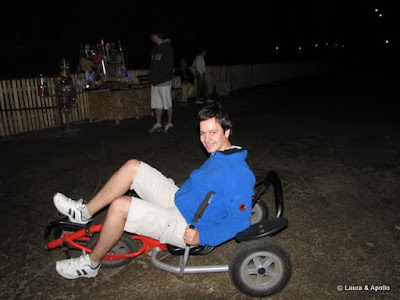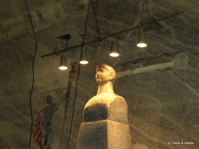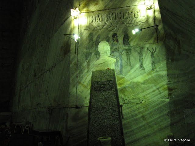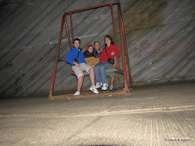 Salina e chiar interesanta. Nu are mirosul persistent de sare pe care l-am simtit la Cacica, iar salile sunt foarte inalte, cam de 50 de metri. Incepem sa ne plimbam usor prin spatiul care iti da mai degraba impresia de imensitate decat de tunel de mina. Eu si Tavi ne testam indemanarea de fotografi in conditii vitrege, de lumina putina. Cu toate astea reusim sa facem cateva poze bune (parerea mea, plina de modestie). Gasim un loc de joaca pentru copii si nu putem rezista tentatiei (de cand nu ne-am mai dat in leagane…). Trecem pe langa sanatoriul amenajat intr-una din sali si ne intrebam daca poate sa doarma cineva in frigul ala, temperatura in mina fiind de 12 grade. Facem poze la bustul lui Eminescu, cumparam cate o sare de baie cu miros de liliac (sic!) si ne indreptam spre sala genezei, dominata de busturile lui Traian si Decebal. Alaturi e un centru de inchiriat biciclete (9 lei/ 15 minute), cu care vrem sa facem si noi un pic de miscare. Pana se elibereaza bicicletele ma duc sa mai fac cateva fotografii. Sunt intrerupt de Laura care ma trage spre un vehicul cu 3 roti, o combinatie ciudata intre tricicleta si bicicleta. Pedalez pana fac febra la picioare, fac schimb cu Laura, care insa se lasa pagubasa repede. Cand sa ducem bicicletele inapoi suntem invitati sa testam un alt fel de bicileta, de o singura persoana si fara ghidon. Tavi isi face curaj primul, dupa el incerc si eu. E mai usor decat pare la prima vedere, se carmeste intorcad tot corpul intr-o directie sau alta. Foarte interesant, si cu senzatii tari. Trecem pe langa un vagonet de mina, apoi stam inca vreo 40 de minute la coada la lift. Iar senzatii tari, apoi lumina de afara. Ca o paranteza, mina a fost inundata la inceputul anilor 90 si se dorea inchiderea ei definitiva.