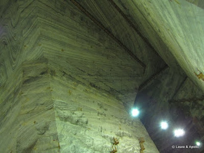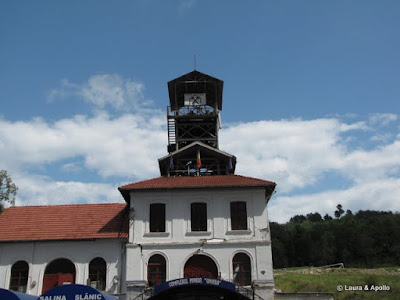 Mergem intai la salina, pe numele ei Mina Unirea. Parcam masina si lichidam urgent o caserola de pepene galben (multumim Roxana!), dupa care ne asezam cuminti la coada. In liftul care coboara in mina incap maxim 10 persoane, la coada sunt vreo 200, avem de asteptat. In sfarsit ne vine si noua randul. Platim taxa de vizitare (14 lei de persoana). Liftul e cu senzatii tari, se scutura serios, mi s-a parut ca tunelul are chiar o curbura pe la jumatate, e inchis total, si usa incuiata pe dinafara. Probabil ca nu ar mai merge multi cu el daca ar vedea traseul…