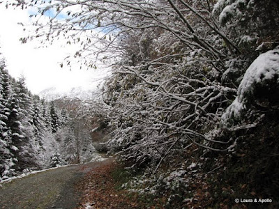 Am ajuns fiecare cum a putut, care cu masinile din dotare, care cu „rechinul”. Noi am impartit masina cu Vladimir si Ancuta, si am transportat „ingredientele” pentru petrecere. Adica echipamentul de karaoke si blatul pentru tort (multumim Ancuta!!!). Ca o paranteza, drumul care pleaca din Rucar spre Satic este neasfaltat, si punctat de nenumarate gropi si „lacuri” de dimensiuni mai mici sau mai mari, in care masina semana mai mult a submarin. Drumul forestier din Satic pana la cabana se prezenta in stare mult mai buna. Peisajul era deosebit. Peste noapte cazuse ceva zapada, care asigura un efect interesant peste copacii imbracati in haine de toamna.
