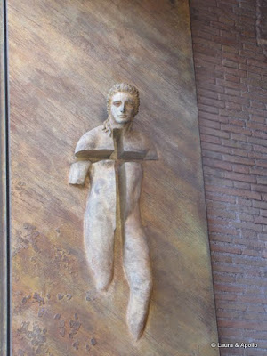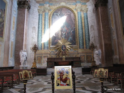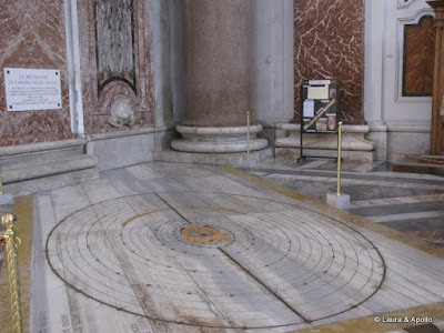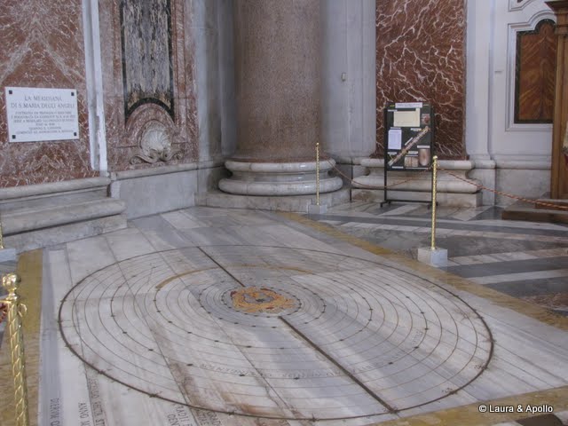 Peste drum se afla termele lui Diocletian. Era cam tarziu, asa ca am lasat pe alta zi (si alta plimbare la Roma, ca n-am mai ajuns). Intr-un colt al termelor se afla Santa Maria degli Angeli, o bisericuta cu un aspect bizar. De fapt un corp al termelor a fost „mobilat” ca biserica. Aici se afla meridianul Romei, dupa care se potriveau ceasurile in Roma. In perete este o fanta prin care intra lumina soarelui, iar cand raza lumineaza linia de pe podea, e ora 12 fix. Cand am ajuns noi era si o nunta, dar nu pareau deranjati de turisti.