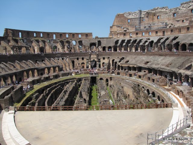 Colosseum-ul are 3 nivele, dar cand am fost noi se putea vizita ultimul „etaj” pentru ca se faceau lucrari de consolidare. La cateva zile dupa ce am plecat din Roma am auzit la televizor ca s-a deschis pentru vizitare si subsolul. Cand am fost noi era extrem de aglomerat, in plus fata de coada de afara, inauntru erau cateva sute de oameni, si se statea la coada la balcoane pentru o poza in care sa nu apari alaturi de alti 20 de necunoscuti. Pe unul din pereti s-a pastrat o fresca ce ilustreaza rastignirea lui Iisus pe Golgota.