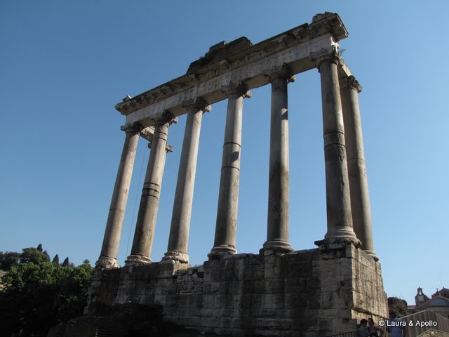Am coborat apoi spre forum. Aici se afla senatul, mai tarziu guvernul republicii, tribunalul, alaturi de mai multe temple si arce triumfale. Ce e interensat de vazut pe aici: templul lui Castor si Pollux, templul lui Saturn, templul Vestalelor, templul lui Antoniu si al Faustinei, templul lui Vespasian si Titus, templul lui Romulus, basilica lui Maxentiu si Constantin, arcul triumfal al lui Titus (ridicat dupa victoria din asediul Ierusalimului din anul 70) si arcul lui Septimius Severus (ridicat in cinstea celor doua campanii impotriva partilor din 194-195 si 197-199), Tabularium-ul (noi l-am vazut doar de la distanta, pentru ca se faceau lucrari de consolidare), Curia (Senatul), si coloana lui Phocas (ultimul monument construit in forum, in jurul anului 608), si nu in ultimul rand, Cloaca Maxima, primul sistem de canalizare din lume. Fiecare imparat important a mai adaugat cate ceva forumului. Astazi sunt clar delimitate partile construiote de Traian, Octavian Augustus, Cezar si Nerva, fiecare avand in fata statuia ctitorului. Din pacate partea de forum ridicata de Traian si Augustus era inchisa pentru renovare, asa ca nu am putut vedea columna de aproape. Nici fotografii prea reusite nu am reusit sa facem, pentru ca este inconjurata la mica distanta de alte cladiri, si nu ma puteam indeparta suficient ca sa o prind intreaga in poza.