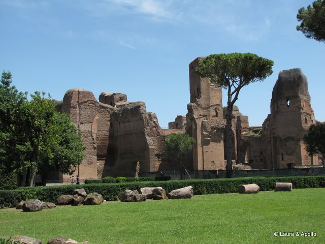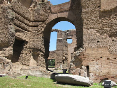 Am mers in continuare pana la Termele lui Caracalla. Biletul de intrare costa 6 euro, si e valabil si la alte doua muzee. Termele au fost construite de imparatul Caracalla, intre anii 212 si 216, si au fost folosite pana in secolul VI, cand ostrogotii au asediat Roma si au distrus instalatiile hidraulice. Complexul imens este construit intr-un stil monumental, si cuprindea un frigidarium (bazin cu apa rece), un tepidarium cu doua bazine (cu apa la temperatura medie) si un caldarium (bazin cu apa calda), doua sali de gimnastica, o piscina exterioara, si nu in ultimul rand, o biblioteca. Se pot vedea si cateva mozaicuri, unele foarte mari si surprinzator de bine pastrate.