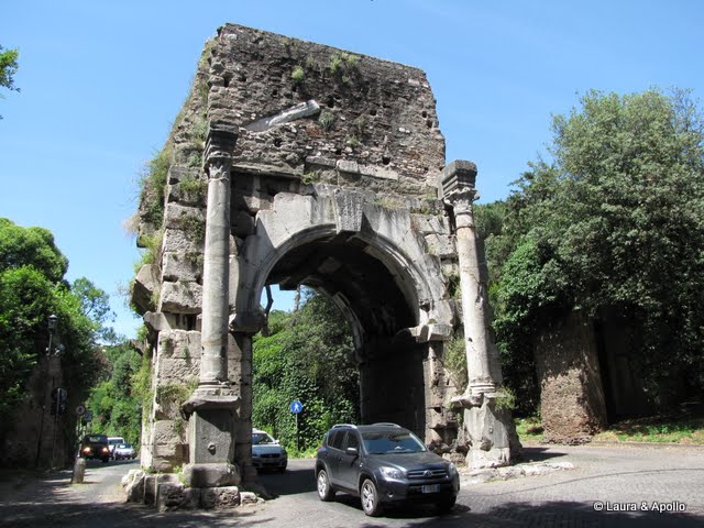 Am trecut pe langa basilica Santa Balbina (datand din secolul IV), dar era inchisa. Mai departe am trecut pe langa o alta biserica, dedicata Sfintilor Nereo si Achileo, tot din secolul IV, si tot inchisa. Am pornit mai departe spre poarta San Sebastiano. Daca pana acum strazile erau largi, strada pe care mergeam acum, care urmeaza traseul drumului antic Via Apia pana la zidurile aureliene, era mult mai ingusta, si fara trotuar. Inainte de a ajunge la poarta drumul trece pe sub Arcul lui Drusus. Doar una din cele 3 arce mai exista astazi. Nu se cunoaste nici numele celui care l-a construit, si nici perioada in care a fost ridicat. In timpul imparatului Caracalla, peste arc a fost construit un apeduct care alimenta termele.