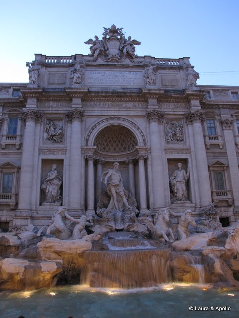 Am parasit Piazza di Spagna si ne-am indreptat spre Fontana di Trevi, trecand pe langa o coloana ce avea in varf o statuie a Sfintei Maria. Drumul ne-a dus pe stradute inguste si intortocheate, dar foarte pitoresti. Ne-am ratacit un pic pe drum, dar asta ne-a dat ocazia sa mai exploram putin orasul si sa ne tratam cu inca o inghetata delicioasa. In final am ajuns si la fantana, chiar la apusul soarelui. Si aici era o aglomeratie teribila, iar efortul de a face o poza in care sa nu apara 4-5 necunoscuti era extrem de mare.