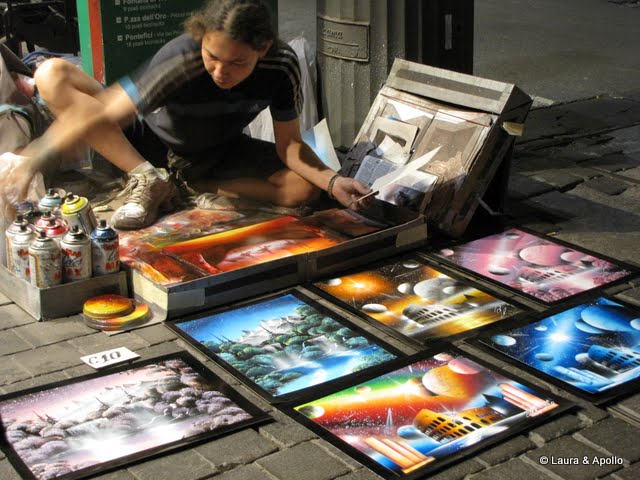 Tot pe drum ne-am oprit intr-o piateta unde se adunase multa lume. Un tanar al carui aspect imi aducea aminte de copii strazii facea tablouri. Avea o foaie de hartie, vreo 10 tuburi de vopsea, 3 capace de borcan, si in zece minute desena un peisaj asemanator cu ce ne-am obisnuit sa vedem prin filmele SF. Si nu ducea lipsa de cumparatori.