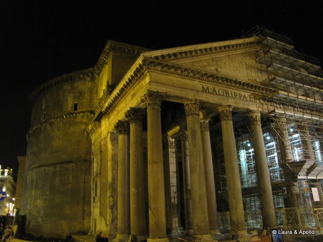 Am plecat intr-un tarziu de langa fantana, cam in graba pentru ca ne era teama ca nu mai prindem metroul inapoi spre hotel. Alergatura ne-a dus pe langa Pantheon, un templu dedicat tuturor zeilor construit in primii ani ai erei noastre, si donat mai tarziu de imparatii romani bisericii, care l-a transformat in biserica dedicata Sfintei Maria. Cupola Pantheonului este inca, dupa mai mult de doua milenii, cladirea cu cea mai mare cupola de beton neranforsata (da, romanii stiau sa faca beton). Pantheonul are o singura sursa de lumina, o deschidere in centrul cupolei. Sub el se afla un sistem de scurgere pentru apa care curge in timpul furtunilor. Din pacate jumatate din fatada era acoperita de schele, lucru de natura sa zadarniceasca toate eforturile mele fotografice. In plus era foarte tarziu, asa ca nu l-am mai vizitat. Am aflat mai tarziu ca imparatul Constantin II a vizitat roma in anul 663 si a ordonat ca tot ce era facut din metal ca ornament pentru oras sa fie demontat si trimis la Constantinopole. Astfel multe cladiri antice au ramas fara acoperis si au fost distruse complet in evul mediu.