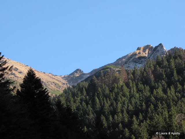 Am ajuns in sfarsit si la Sambata de Sus. In fata manastirii ne intalnim cu alti tovarasi de drum, care au fost atat de draguti incat sa ne astepte, ca sa ne ajute la transportul tortului pana la cabana. Am parcat masinile in fata pastravariei (care cica ar hrani pestele cu concentrate dubioase, deci nu-i ecologic), am impartit bagajele si am pornit spre munti. Drumul e surprinzator de lejer daca te gandesti ca e vorba de Fagaras. La inceput e un drum forestier, apoi se transforma in poteca lina care urmeaza cursul paraului Sambata. Din loc in loc drumul traverseaza valea pe niste podete de lemn, asa ca nu a fost nevoie s-o trec pe Laura in brate peste rau. Soarele care ne rasfata a facut a avut insa si efecte mai putin placute, pentru ca a topit putina zapada care cazuse cu cateva zile in urma, asa ca noroiul acoperea tot drumul. Din fericire dupa ce am intrat in padure a fost chiar ok. Peisajul este foarte frumos. De pe versanti se formeaza cateva cascade, unele destul de inalte, care dau un farmec salbatic locului. Dupa vreo 2 ore si jumatate de mers lejer am ajuns in fata cabanei, de unde am facut cateva fotografii cu crestele insorite ale muntilor.