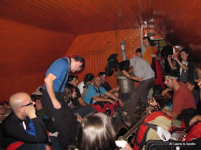 O parte din grup a plecat mai sus, spre creasta, altii s-au asezat sa se odihneasca un pic. Am mancat si o ciorba de fasole fierbinte, care ne-a prins tare bine pentru ca desi afara era soare se lasase tare frig. La venirea serii ne-am retras in cabana si am inceput sa povestim. Dupa ce s-a intors toata lumea de pe poteci ne-am adunat toti intr-o camera, ca sala de mese era ocupata de alti petrecareti. A aparut intai o chitara, apoi altele. S-au cantat de toate pentru toti. Pe langa veteranii Vladimir si BauBau am avut si doi debutanti, Mateo si Magda.