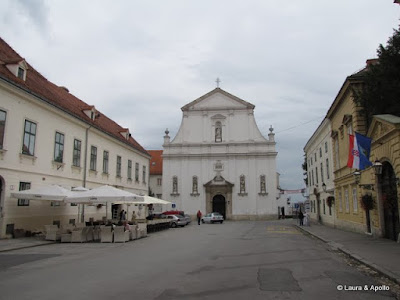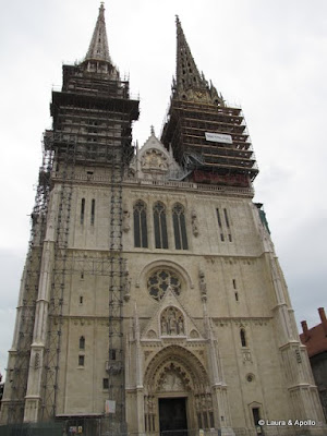 De aici ne-am intors la masina si am mutat-o ceva mai aproape de Orasul de Sus. Am reusit sa facem rost si de niste fise, asa ca ne-am putut plimba linistiti. Orasul de sus este nucleul medieval al Zagrebului, si a fost multa vreme impartit in doua: Kaptol, unde se afla scaunul episcopal, in jurul catedralei, si Gradec, orasul liber in care traiau negustorii si mestesugarii. Prima oprire a fost la catedrala, care este inconjurata de ziduri . Desi sunt de origine slava, croatii sunt catolici. De fapt, in afara de motivele etnice, religia a fost unul catalizatorii razboiului (sarbii sunt ortodocsi, iar bosniacii – musulmani). Lucrarile de constructie au inceput in secolul 13, si a fost renovata de mai multe ori. Si cand am vizitat-o noi, cele doua turnuri erau acoperite de schele. Inauntru se gaseste o placa imensa acoperita cu caractere glagolitice (o forma arhaica a alfabetului chirilic). Intre timp si alfabetul chirilic a fost abandonat, croatii optand pentru scrierea latina.