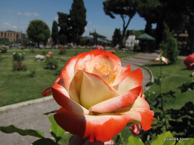 Am coborat de pe colina pe partea cealalta si am ajuns la Roseto Comunale, gradina de trandafiri. Fiind inceput de vara, toti trandafirii erau infloriti. Ne-am oprit sa ne odihnim, sa rontaim niste alune si sa admiram florile. In timp ce stateam pe o banca a aparut un porumbel care poftea la alunele noastre. I-am dat una, apoi inca una, asa ca zburatorul a devenit tot mai curajos, si cand ne-am ridicat mai avea un pic si se baga direct in punga cu alune. Am facut cateva poze cu florile, mai ales ca unele erau foarte exotice, originare din Asia sau din America de Sud.