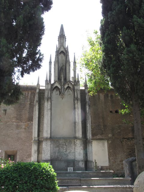 Am plecat de langa piramida, de-a lungul zidurilor, si am ajuns langa cimitirul protestant. Desi nu era in plan sa-l vizitam, daca tot am ajuns langa el, am hotarat sa intram. Sincer, cimitirele mi se par o atractie turistica un pic morbida, dar nu toata lumea e de aceeasi parere, ca era ceva aglomeratie. Nu exista taxa de vizitare, in schimb e un afis care cere o „donatie” de minim 2 euro de persoana (interesanta donatia asta obligatorie). Multe din morminte sunt decorate cu sculpturi. Cele mai celebre sunt insa cele alea lui Percy Bysshe Shelley si John Kates. Mormantul lui Kates e special nu atat prin decoratiuni, cat prin faptul ca e singurul pe care nu e mentionat numele, ci doar epitaful: „This grave contains all that was mortal, of a YOUNG ENGLISH POET, Who on his Death Bed, in the Bitterness of his Heart, at the Malicious Power of his Enemies, Desired these Words to be engraven on his Tomb Stone: Here lies One Whose Name was writ in Water.”