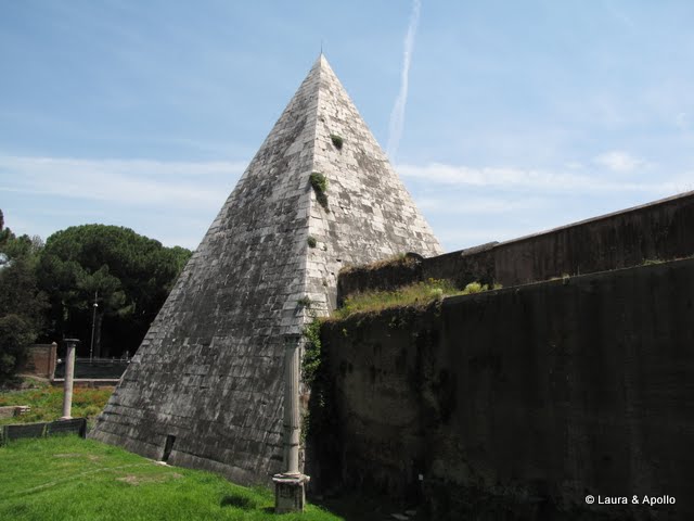 In dimineata asta ne-am trezit mai tarziu, ca eram foarte obositi dupa vizita la Vatican. Dupa micul dejun am coborat la metrou, ca sa mergem (din nou) la piramida. Metroul ne-a lasat in fata portii San Paolo, langa obiectivul nostru. Piramida a fost construita cu 18 ani inainte erei noastre de Caius Cestius, un important nobil roman, pentru a-i servi ca mormant. Forma ei este inspirata de piramidele egiptene (mai exact de piramidele din Nubia, in sudul vaii Nilului). In acea perioada in Roma era considerat „cool” tot ce era de origine egipteana, iar un mormant asemanator cu ale faraonilor era intr-adevar ceva deosebit. Nu este singura piramida construita in Roma, dar e singura care mai exista in zilele noastre. Mai tarziu a fost inclusa in zidurile aureliene, motiv pentru care a ramas in s-a pastrat in stare buna. Dupa finalizarea constructiei, piramida a fost sigilata, si nu poate fi vizitata pentru ca nu exista intrare. In curtea din jurul ei functioneaza un adapost pentru pisici.