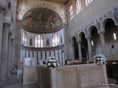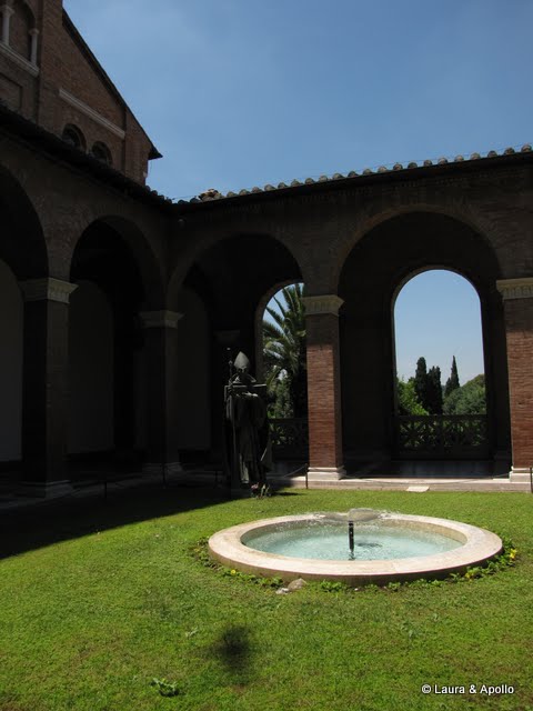 Am mai mers putin si am ajuns in fata basilicii Santa Sabina. Biserca dateaza din secolul 5, si are inca usile originale, din lemn masiv, si clopotnita din secolul 10. Interesant la bisericile din Roma e ca totul e automatizat. Bagi un euro, se aprinde o „lumanare” (un bec), bagi in alta parte doi euro, se aprinde lumina ca sa poti vedea decoratiunile. Spre deosebire de alte basilici, care au deocratiuni foarte bogate, Santa Sabina are decoratiuni foarte simple, majoritatea albe. In fata se afla un tei imens, care era inflorit, si raspandea un miros imbatator.