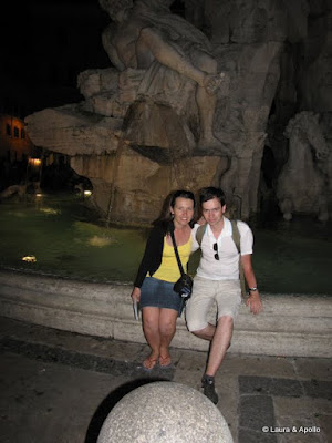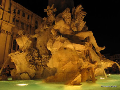 Inca nu era foarte tarziu, asa ca ne-am indreptat spre Piata Navona. Eu propun autobuzul, Laura insista sa mergem pe jos, ca stie ea o scurtatura. Protestez (de unde sa stii, ca doar n-am mai calcat niciodata pe aici???), bineinteles degeaba, dar pana la urma cedez si ma iau dupa ea. In maxim 10 minute ajungem, iar eu ma recunosc infrant (nici nu stiu pentru a cata oara) in fata spiritului ei de orientare. Pe acest loc era in antichitate un stadion, construit de imparatul Domitian. Cladirile din jurul pietei sunt asezate pe o linie usor arcuita, dupa forma arenei. In centru se afla fantana celor patru fluvii, compusa dintr-un obelisc egiptean inconjurat de patru statui care infatiseaza Dunarea, Nilul, Gangele si Rio de la Plata. Ne-am relaxat cateva minute in jurul fantanii, am admirat artistii care faceau portrete domnisoarelor, am mai luat o inghetata (asta a ramas un leit-motiv al calatoriei la Roma) si ne-am indreptat apoi spre statia de autobuz.