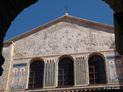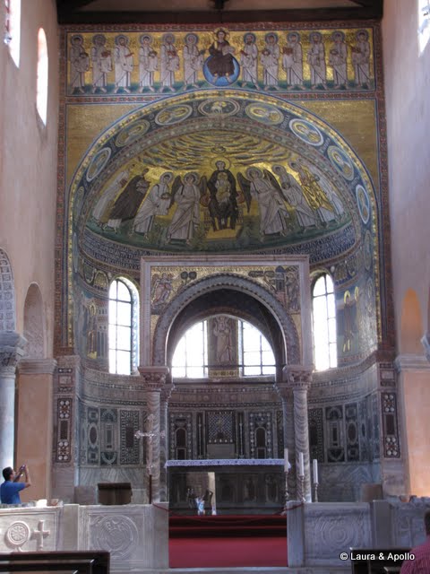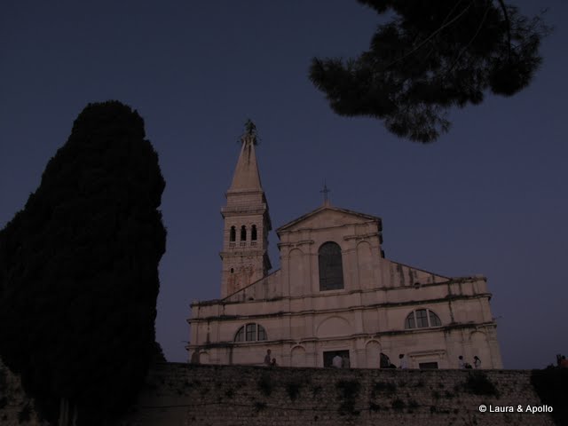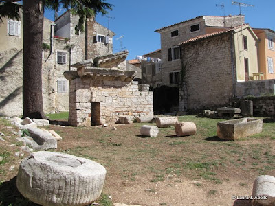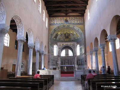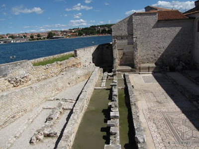 Istria, alaturi de Dalmatia de Nord au fost o vreme sub ocupatie venetiana, lucru care se observa usor atat in arhitectura cladirilor, cat si in numarul mare de vorbitori de italiana. Interiorul peninsulei e punctat de orasele mici, multe din ele construite in jurul unui castel (din cate am citit, cu arhitectura mai austera). Noi am hotarat sa nu ne oprim, ci sa continuam spre coasta Marii Adriatice. Prima oprire a fost la Poreč. Oraselul a luat fiinta acum 2200 de ani, prin construirea unui castru roman ale carui urme se mai vad si astazi. Orasul vechi respecta planurile organizate ale oraselor fondate in timpul Imperiului Roman, cu strazi paralele sau perpendiculare. Centrul istoric se afla pe o peninsula (ca la mai toate orasele de pe malul marii Adriatice). Mergand printre magazine, cafenele si gelaterii (apropo, croatii au invatat sa faca inghetata de la vecinii italieni, si au invatat bine) am ajuns la basilica, aflata in patrimoniul Unesco. Basilica a fost construita in secolul 6 de episcopul Eufrasius, pe ruinele unei biserci mai vechi, si este unul din cele mai interesante exemple de arhitectura bizantina timpurie din regiunea mediteraneana. Este decorata cu mozaicuri care dateaza din secolul 6, pastrate intr-o stare surprinzator de buna. Teoretic fotografiatul in interior este interzis, dar cum toata lumea facea poze, am tras si noi cateva cadre. Alaturi se afla palatul episcopal, transformat in muzeu. De la ferestrele lui se poate vedea in gradina basilicii, unde se pastreaza un alt mozaic, care forma podeaua bisericii din secolul 4. Am parasit basilica si ne-am tratat cu o inghetata, apoi ne-am indreptat spre port, unde am avut prima intalnire cu Marea Adriatica. Se spune ca intr-o zi senina din clopotnita bisericii se poate vedea Venetia. Noi n-am avut noroc, pentru ca turnul era inchis in acea zi, dar in schimb se vereau muntii de pe malul italian. Soarele si briza marii ne-au rasfatat pana dupa pranz, cand am plecat spre sud.