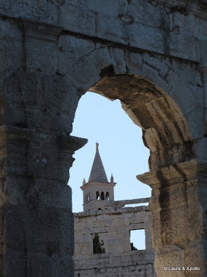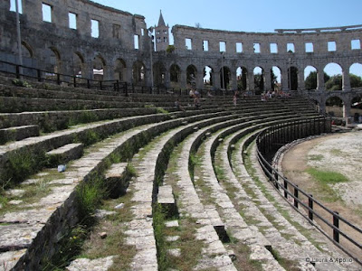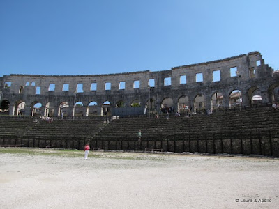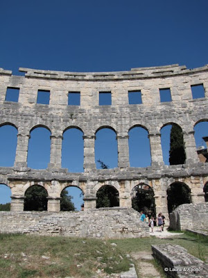Dupa micul dejun am profitat de cateva minute de relaxare (si de faptul ca in restaurant aveam semnal la conexiunea internet, spre deosebire de camera noastra) ca sa ne rezervam cazare pentru seara urmatoare, pe insula Krk. Apoi am pornit spre Pula. Traficul extrem de aglomerat ne-a pus ceva probleme, in incercarea de a gasi un loc unde sa parcam masina regulamentar, ca nu voiam sa ne trezim pietoni la 2000 de kilometri de casa. Am sfarsit, am gasit un loc in apropierea portului, si am plecat sa exploram orasul. Pula a fost fondata de triburile ilire, si a fost cucerita de romani acum 2200 de ani. In centrul orasului a rezistat pana azi amfiteatrul roman, fratele mai mic al Colloseum-ului din Roma. Cand spun „a rezistat” nu ma refer doar la trecerea anilor, ci si la mana omului: au existat mai multe tentative (abandonate) de a demonta arena pentru a o transporta in Italia (intai venetienii, in secolul 14, apoi fascistii). O mica parte din fatada era acoperita din cauza unor lucrari de reconditionare. Cladirea este intr-o stare surprinzator de buna (nu s-a prabusit nici un perete), si nu si-a pierdut inca destinatia originala: e folosita in continuare pentru spectacole, ce-i drept, cu o tematica usor diferita de cea abordata de romani: gladiatorii si leii sunt azi doar o amintire, in schimb aici se desfasoara in fiecare an festivaulul de film de la Pula, si sunt organizate regulat concerte. La subsol se afla un mic muzeu unde sunt expuse obiecte descoperite in amfiteatru, alaturi de reconstituiri ale tehnologiilor folosite de romani.