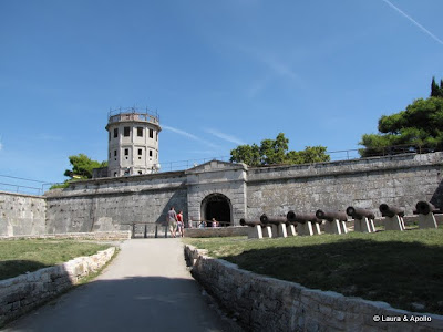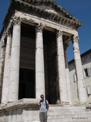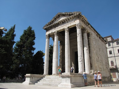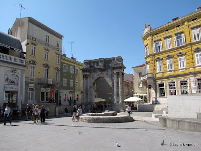 Parasind amfiteatrul am incercat sa gasim drumul spre centru, lucru un pic mai complicat decat pare la prima vedere. Am gasit pana la urma muzeul de arheologie, care are in spate un teatru antic. De aici am reusit sa ne orientam si ne-am indreptat spre arcul de triumf al lui Sergius, care celebreaza o familie locala influenta. Langa monument exista o terasa la care poti sta la aceeasi masa cu James Joyce (ma rog, cu statuia lui) – un celebru scriitor irlandez care a locuit aici o vreme. Am trecut pe sub arc si ne-am continuat plimbarea spre centrul istoric al orasului. Pe locul unde acum 2000 de ani se afla forumul roman se afla acum o piata publica, in mijlocul careia se afla primaria, ridicata in secolul 13 in jurul templului Dianei. A ramas intact doar templul lui Augustus. De aici am urmat stradutele spre varful dealului, unde se afla un fort venetian in forma de stea, care adaposteste astazi muzeul de istorie al Istriei. Din pacate timpul nu ne-a permis sa-l vizitam, asa ca ne-am indreptat spre locul unde lasasem masina si am plecat mai departe, spre Rijeka.