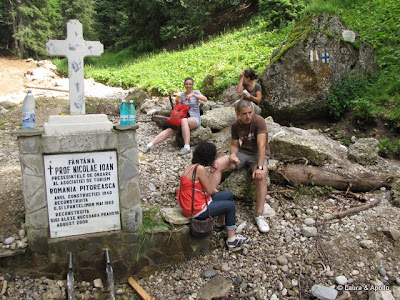 Ne-am inghesuit in 3 masini si am pornit la drum. Inainte de Ploiesti am facut o halta la o benzinarie si am alimentat, masinile cu benzina, noi cu cate un suc sau bere (fara alcool, desigur). Centura de vest a Ploiestiului era complet blocata, asa ca am luat-o pe centura de est. Nu mai fusesem niciodata pe acolo, asa ca ne-am ratacit un pic, dar am gasit pana la urma drumul bun, si pe la ora 11 ajungeam la Cheia. Ne-am cazat pe pensiunea Stana lupilor, ne-am lasat bagajele, am pregatit un rucsac si ne-am intalnit din nou langa masini, care ne-au dus rapid pana la locul unde drumul spre cabana Muntele Rosu se desparte din DN1A. Aici am lasat masinile si am pornit spre cabana pe poteca ce serpuieste prin padure. Aerul curat ne-a dat ceva energie, si am ajuns relativ repede. In poienita din fata cabanei se adunasera o gramada de gratargii. Ne-am uitat la ei si am ajuns repede la concluzia ca aici nu-i de noi, asa ca ne-am astamparat repede setea si foamea (cica fac astia niste clatite bune), si am plecat mai departe spre (fosta) cabana Ciucas. Drumul prin padure e lejer, pana la fantana Nicolae Ioan, la intersectia cu drumul care vine dinspre Valea Berii. Aici ne-am oprit pentru odihna si un sandwish.