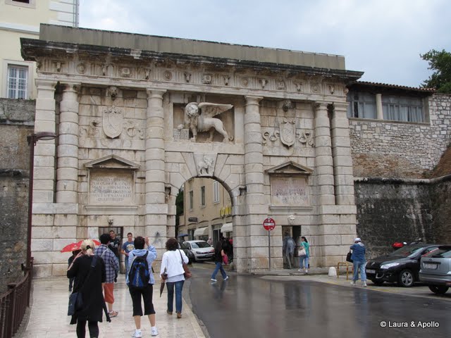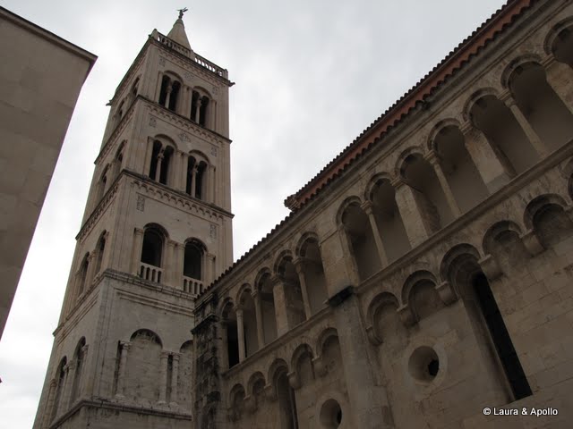 N-am abandonat totusi orasul, si in dimineata urmatoare ne-am intors, de data asta cu masina. Centrul istoric se afla pe o peninsula, care e despartita de restul orasului de port. Am trecut pe sub poarta monumentala, construita in timpul ocupatiei venetiene, si ne-am plimbat pe stradutele inguste ale orasului. In mijloc, intr-o piata mare am descoperit ramasitele forumului roman, iar alaturi, biserica Sfantul Donatus, care a fost ridicata in secolul 9 folosind materiale din constuctiile romane. Spre deosebire de catedrala din Nin, aceasta e mult mai masiva. Acum nu mai e folosita pentru slujbe, dar poate fi vizitata de turisti, lucru pe care l-am facut si noi. Am mers apoi la capatul peninsulei, unde se afla orga marii – e un sistem ingenios prin care valurile care lovesc malul imping aerul prin niste tuburi de orga si produc sunete, uneori surprinzator de armonioase. Alaturi se afla „discul solar”, un ecran gigantic pe care noaptea se proiecteaza constelatiile, sau jocuri de lumini. Din larg se apropia rapid o furtuna, asa ca n-am rezistat acolo decat cateva secunde. Am incercat sa ajungem la adapost inainte sa inceapa ploaia, dar n-am reusit. Ne-am indreptat spre o pizzerie din apropiere, dar pana am intrat acolo era deja murati. Ne-am asezat la o pizza pentru vreo jumatate de ora, pana s-a oprit ploaia, apoi ne-am intors la masina si am plecat spre Šibenik .
