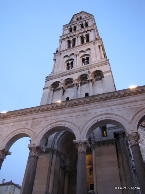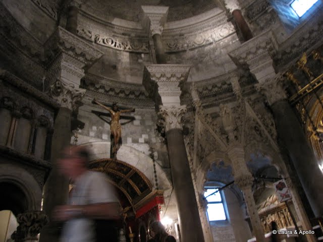 Stiind toate acestea, am ajuns la Split cu sperante mari. Socul initial a fost mare, pentru ca palatul era inconjurat de un bazar, ceva gen Obor in vremurile lui „bune”, plin de tarabe la care se vindea orice, de la portocale la cizme. Am intrat, si ne-am plimbat pana in zona centrala, dar peisajul din afara zidurilor era prezent, ce-i drept la o scara mai mica, si in interior: tarabe cu tot felul de minuni, magazine ale unor marci celebre, o sala de gimnastica… Am fost foarte dezamagit de ce-am gasit acolo, pentru ca imaginea pe care mi-o formasem citind era cu totul alta. Acum, privind in urma, imi dau seama ca aceasta cladire s-a pastrat tocmai pentru ca oamenii au locuit aici. Atunci locul a incetat sa mai fie palat, si a devenit un oras in toata regula, cu case, pravalii si biserici. In perioada medievala, Split-ul era Palatul lui Diocletian, iar oamenii l-au schimbat ca sa se potriveasca mai bine cu nevoile lor.