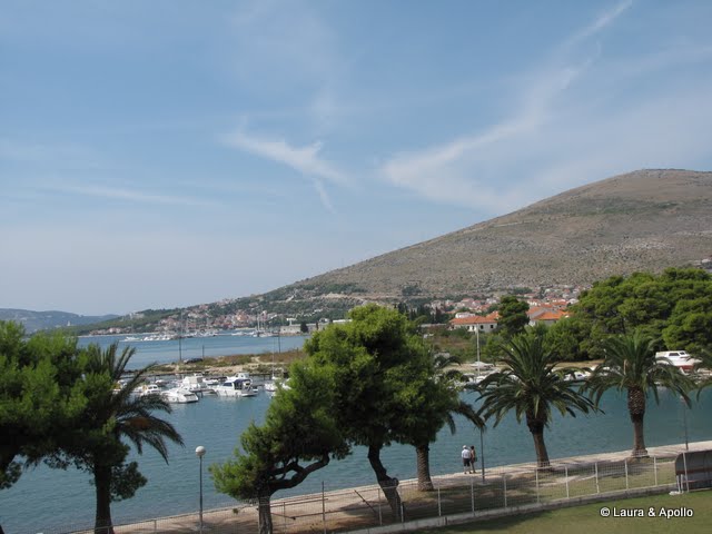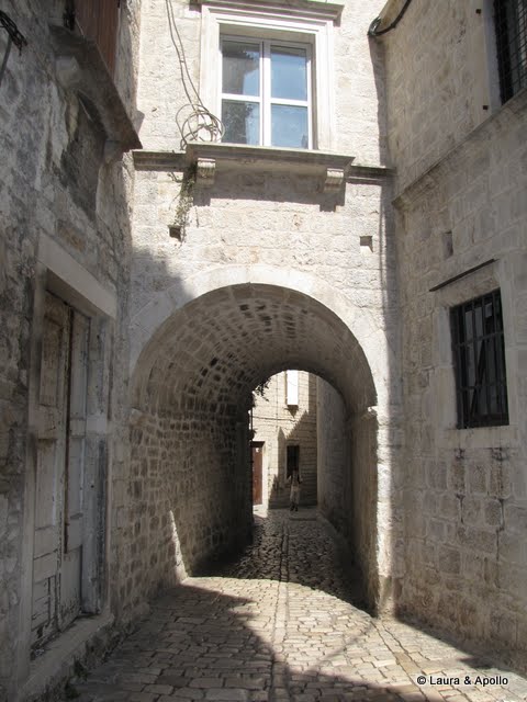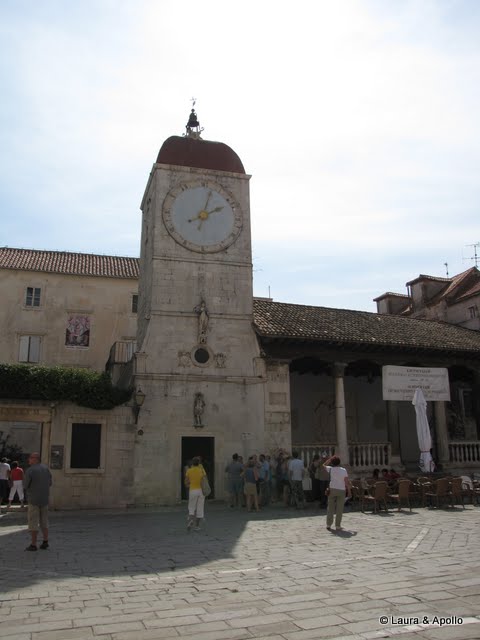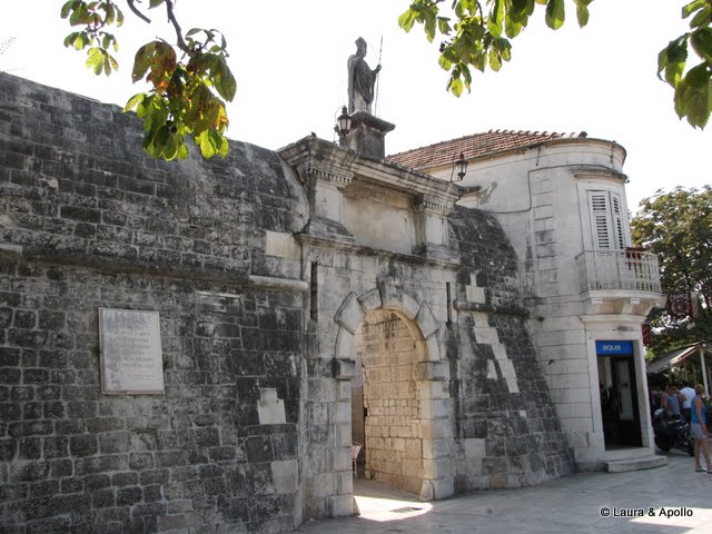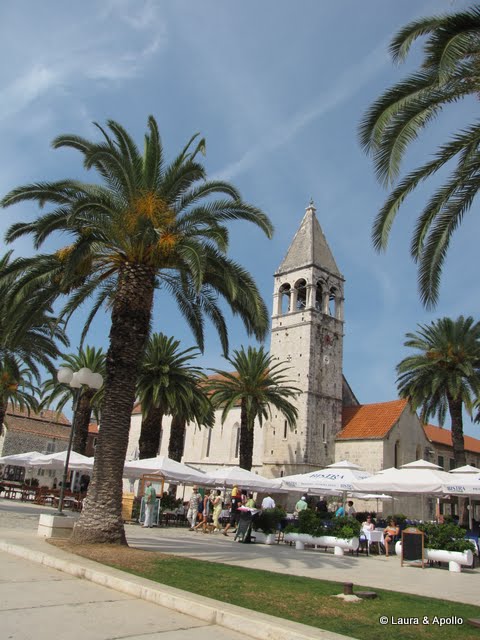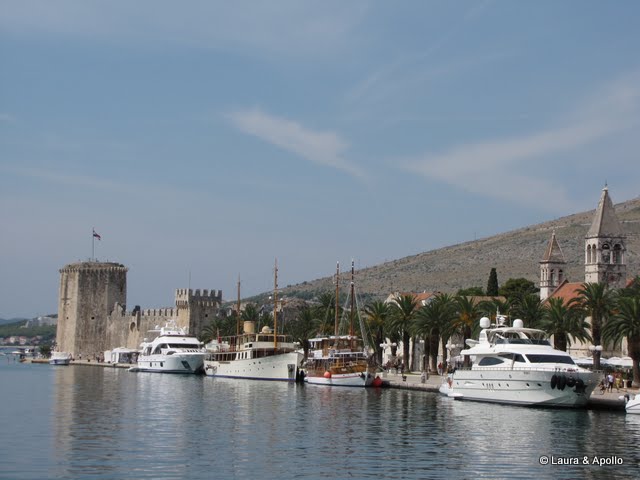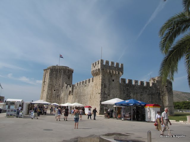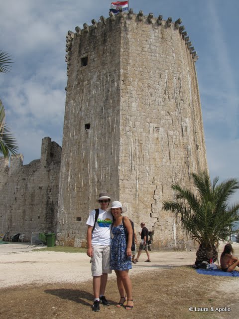 Trogir este asezat pe o mica insula. Orasul a fost fondat de colonistii greci cu 2300 de ani in urma, a fost ocupat succesiv de romani, venetieni si habsburgi, si este inclus pe lista patrimoniului mondial protejat de Unesco. O plimbare pe faleza umbrita de palmieri ne-a adus langa castelul Kamerlengo, construit de venetieni in secolul 15 ca resedinta a guvernatorului. Ca si alte monumente antice sau medievale de acest gen, este folosit si azi ca scena pentru spectacole. Castelul e de fapt mai mult cetate, doar unul din turnuri era locuinta, restul era folosit de militari. O plimbare pe zidurile sale inalte ne-a dezvaluit orasul mai de aproape. Am incercat sa memoram locurile unde voiam sa ajungem, apoi am iesit afara ca sa mai facem cateva fotografii. In timp ce incercam sa-i fac Laurei o poza cu cetatea, aud o voce din spate care ma intreaba: „Nu vreti sa va facem noi o poza?”. Charlotte si Marius, de care ne despartisem cu doua zile inainte la Plitvice, ne zambeau de la cativa metri distanta. Am acceptat bucurosi, si am continuat plimbarea prin oras impreuna.