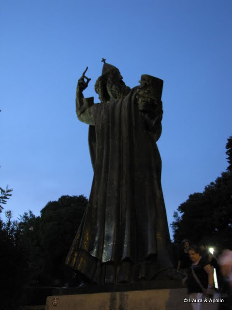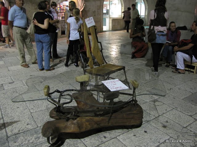 Ne-am plimbat pe stradutele palatului (suna ciudat, nu?) pana la lasarea noptii. Am trecut pe langa statuia episcopului Grgur Ninski, mult mai mare decat cele din Varazdin si Nin. Am luat niste clatite, ca ne cam razbise foamea, si in timp ce asteptam sa fie gata, am cascat gura pe la comerciantii din jur. Unul din ei avea de vanzare niste obiecte „decorative” absolut hidoase (ori asta, ori n-avem noi gust artistic): un bustean cu 3 potcoave pe el si un geam deasupra formau o masuta, cu un pret „de criza” de 33.000 de euro. Am ajuns pe malul marii, unde am luat loc pe o bancuta si am incheiat ziua privind vapoarele care veneau si plecau.