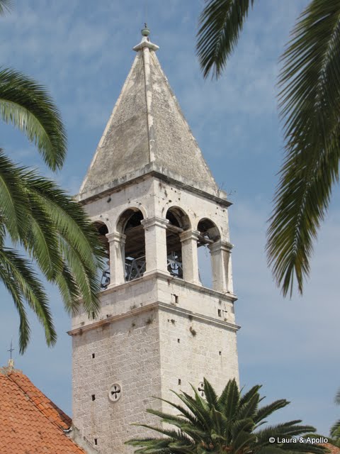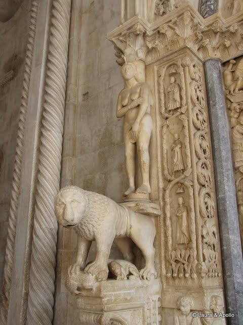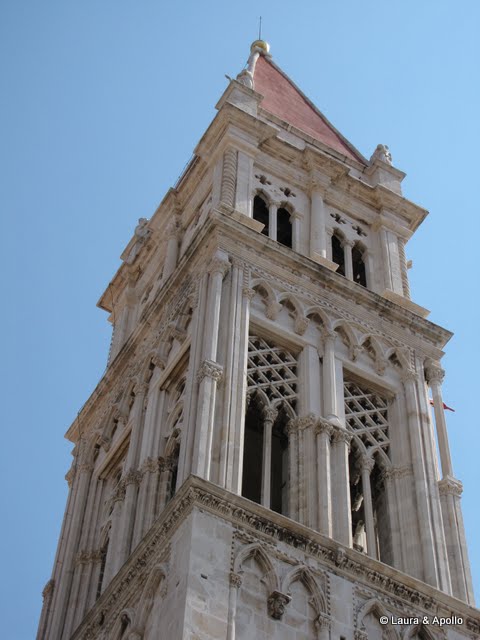 Stradutele inguste ale Trogir-ului ne-au calauzit pe toti 4 pana la catedrala Sfantul Laurentiu, cel mai impozant monument din oras. Catedrala a fost construita la inceputul secolului 13 in stil romanic si gotic, pe fundatiile unei biserici mai vechi care a fost distrusa de sarazini in timpul unui asediu. Turnul a fost ridicat mai tarziu, iar constuctia lui a durat mai mult de 200 de ani, timp in care parti din el au fost demolate si refacute. Interesant este ca din aceasta cauza, fiecare nivel al turnului este construit intr-un alt stil. In timp ce vizitam catedrala a intrat si un grup de turisti germani insotiti de un ghid, iar Marius si Charlotte au jucat rol de translatori, ca sa intelegem si noi explicatiile.