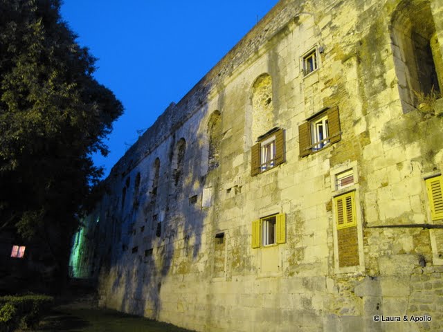 Ne-am oprit la hotelul la care aveam cazare in acea noapte si am lasat bagajele, apoi am plecat sa vizitam orasul. Pe drum am putut vedea ce a ramas in urma incendiilor din vara. Toata padurea de pe deal era carbonizata, iar focul ajunsese la cateva zeci de metri de primele case. La prima vedere, Split-ul e un oras puternic industrializat, impanzit de blocuri, ca si Bucurestiul. Parcarea a fost un adevarat cosmar. Ne-am invartit jumatate de ora, timp in care n-am gasit nimic liber (cu plata sau fara). Am lasat masina pe o strada laterala si am mers pe jos cam 1 km pana la port. Langa port se afla cel mai important monument din Split, inscris si el pe lista Unesco, palatul lui Diocletian. Palatul a fost construit in primii ani ai secolului 4, ca resedinta pentru imparatul Diocletian, care era originar din Dalmatia. El a fost primul imparat care a decis voluntar sa se retraga de la conducerea Imperiului Roman, si a construit in apropierea orasului sau natal acest loc de retragere. Palatul este un complex imens de cladiri, care adapostea in jur de 9000 de oameni, si era impartit in doua parti. In partea dinspre mare erau locuintele imparatului si ale suitei sale, iar in partea opusa, cladirile militare. De altfel, palatul este construit ca o veritabila fortareata, cu ziduri groase, care puteau rezista cu usurinta unui asediu. Dupa caderea Imperiului Roman de Apus, a fost abandonat, dar in urma atacurilor slavilor si avarilor din secolul 7, locuitorii din zona s-au refugiat la adapostul zidurilor sale. De atunci a fost locuit fara intrerupere si este cel mai bine pastrat palat roman din lume.