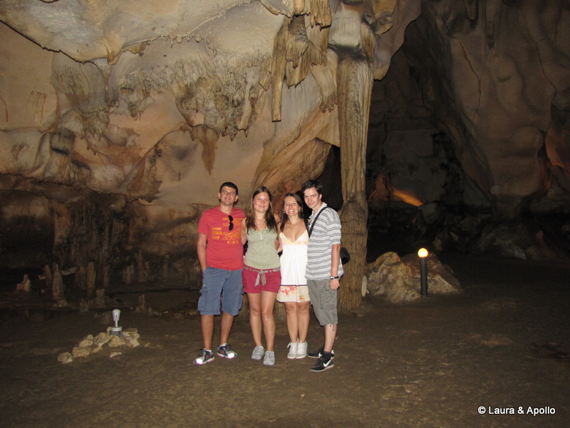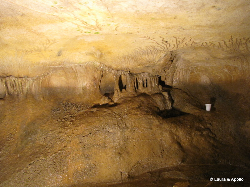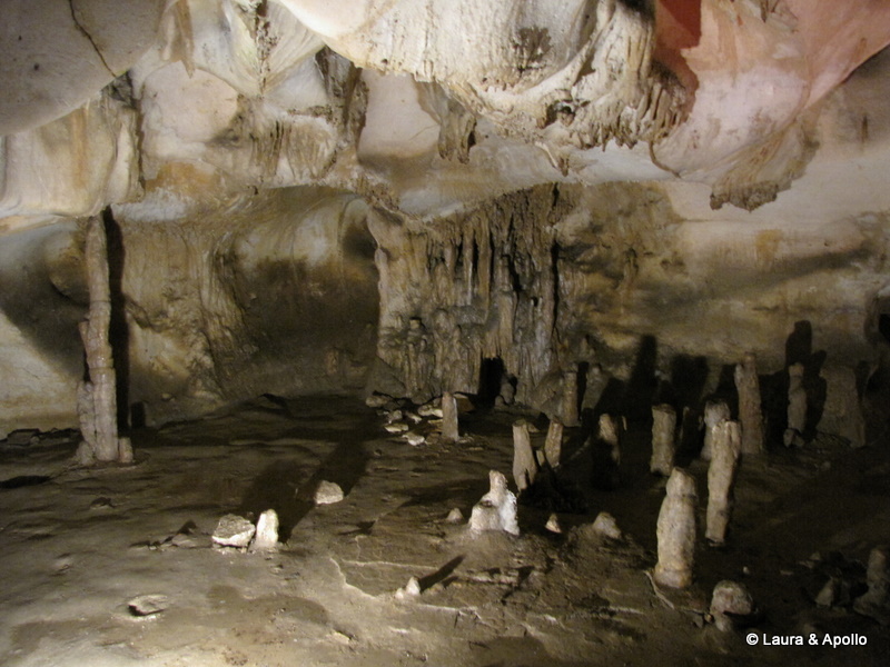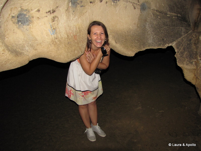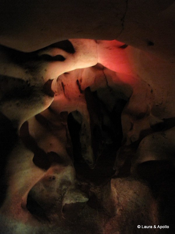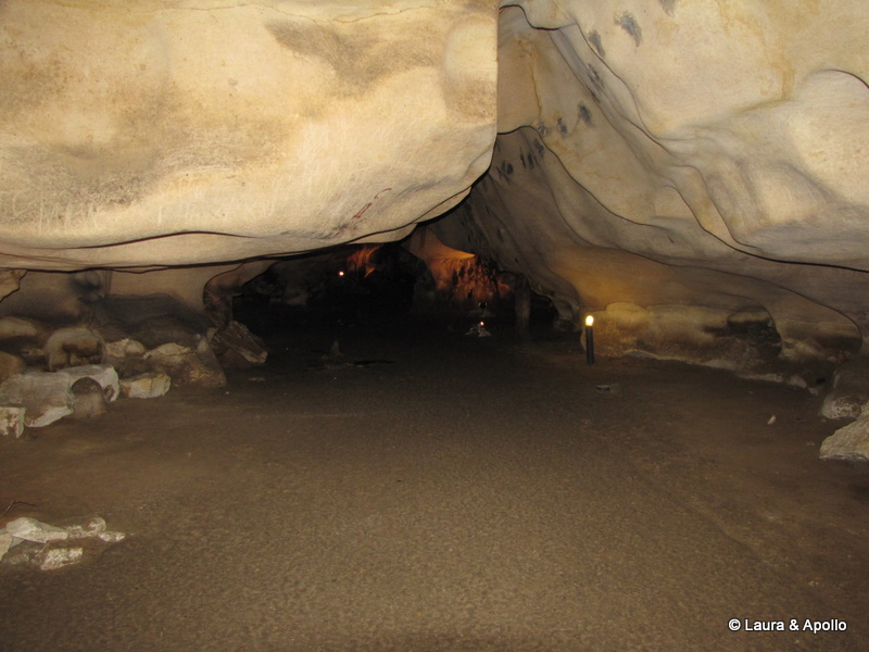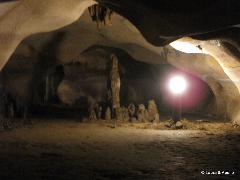La intrare se ajunge coborand o scara abrupta. Am cumparat biletele (5 leva de persoana) si am asteptat ghidul, un batranel foarte simpatic. Turul incepe la fiecare ora fixa, si dureaza cam 40 de minute. Atunci eram numai noi patru, asa ca turul a fost in franceza (engleza nu stia), condimentat cu cateva cuvinte in romaneste pe care le invatase de la alti vizitatori. Pestera este uscata, iar peretii din calcar alb contrasteaza puternic cu intunericul din galeriile secundare. Luminile bine plasate isi schimba din cand in cand culoare, din alb in rosu sau albastru. Mi s-a parut ciudat ca nu exista nici o muchie ascutita, totul e perfect rotunjit (din cate am inteles niste vietuitoare minuscule sunt responsabile pentru lucrul asta, dar nu bag mana-n foc). Galeria principala este foarte larga si dreapta, si a primit numele de „Marele bulevard”. In apropierea intrarii se afla un izvor. Legenda spune ca celui care bea apa din acest izvor i se va implini o dorinta. Numai eu am baut, dar nu va pot spune care a fost dorinta (nu s-a implinit inca, dar mai am sperante, ca legenda nu zice nimic de termene limita 🙂 ). Am avut parte si de un mic concert sustinut de ghidul nostru, atat cu vocea cat si cu un „instument”: o stalagmita muzicala. Pestera este frumos luminata si descopera privirilor o multime de forme care pun imaginatia la incercare: draperii , soldati de piatra, o padure, doi indragostiti, o familie, un dinozaur, si nu in ultimul rand, Alba ca Zapada si cei 7 pitici. Aici isi au adapostul si catva mii de lilieci, dar noi n-am avut (ne)sansa sa intalnim nici unul. Dupa ce turul s-a terminat am multumit frumos ghidului, si dupa ce am cumparat de la el cateva fotografii, ne-am oprit sa ne odihnim putin pe pajistea din fata pesterii, la marginea unei paduri de pini.