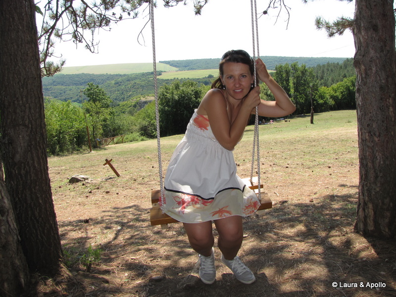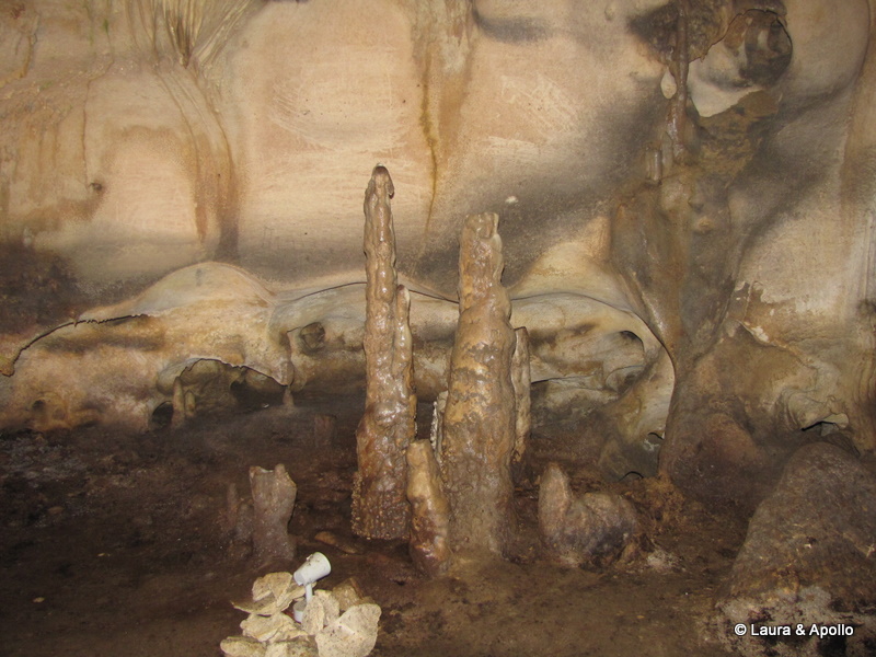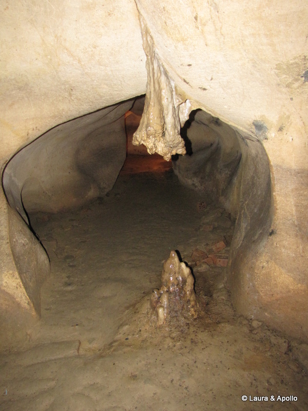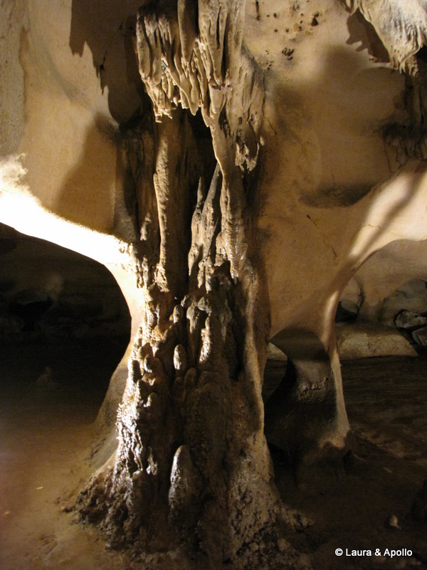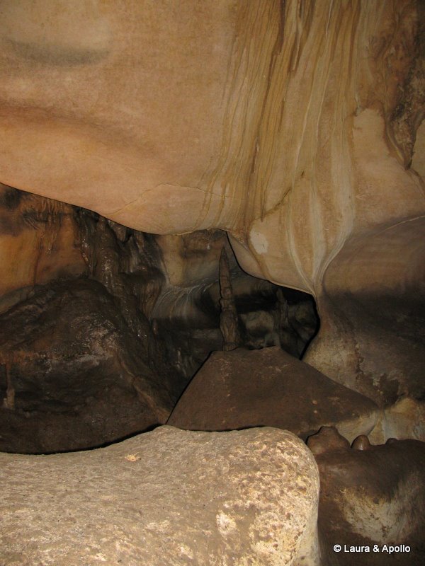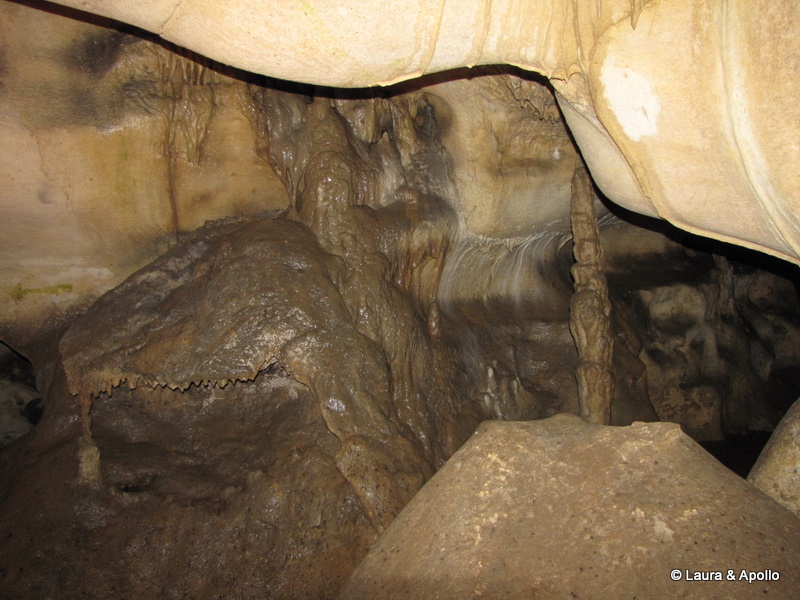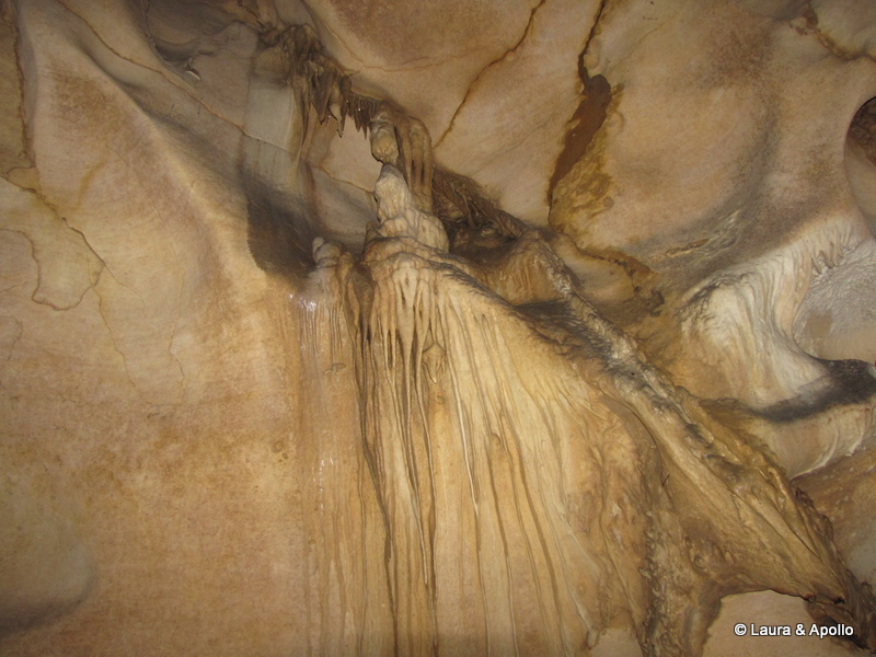 La intrare se ajunge coborand o scara abrupta. Am cumparat biletele (5 leva de persoana) si am asteptat ghidul, un batranel foarte simpatic. Turul incepe la fiecare ora fixa, si dureaza cam 40 de minute. Atunci eram numai noi patru, asa ca turul a fost in franceza (engleza nu stia), condimentat cu cateva cuvinte in romaneste pe care le invatase de la alti vizitatori. Pestera este uscata, iar peretii din calcar alb contrasteaza puternic cu intunericul din galeriile secundare. Luminile bine plasate isi schimba din cand in cand culoare, din alb in rosu sau albastru. Mi s-a parut ciudat ca nu exista nici o muchie ascutita, totul e perfect rotunjit (din cate am inteles niste vietuitoare minuscule sunt responsabile pentru lucrul asta, dar nu bag mana-n foc). Galeria principala este foarte larga si dreapta, si a primit numele de „Marele bulevard”. In apropierea intrarii se afla un izvor. Legenda spune ca celui care bea apa din acest izvor i se va implini o dorinta. Numai eu am baut, dar nu va pot spune care a fost dorinta (nu s-a implinit inca, dar mai am sperante, ca legenda nu zice nimic de termene limita 🙂 ). Am avut parte si de un mic concert sustinut de ghidul nostru, atat cu vocea cat si cu un „instument”: o stalagmita muzicala. Pestera este frumos luminata si descopera privirilor o multime de forme care pun imaginatia la incercare: draperii , soldati de piatra, o padure, doi indragostiti, o familie, un dinozaur, si nu in ultimul rand, Alba ca Zapada si cei 7 pitici. Aici isi au adapostul si catva mii de lilieci, dar noi n-am avut (ne)sansa sa intalnim nici unul. Dupa ce turul s-a terminat am multumit frumos ghidului, si dupa ce am cumparat de la el cateva fotografii, ne-am oprit sa ne odihnim putin pe pajistea din fata pesterii, la marginea unei paduri de pini.