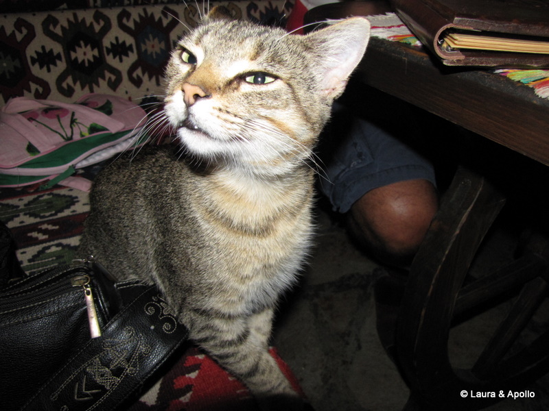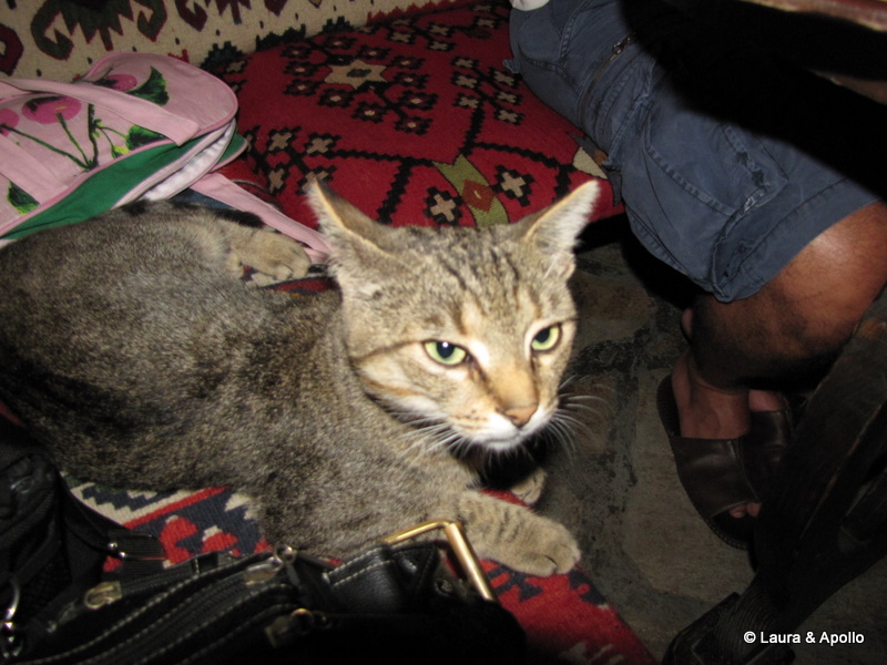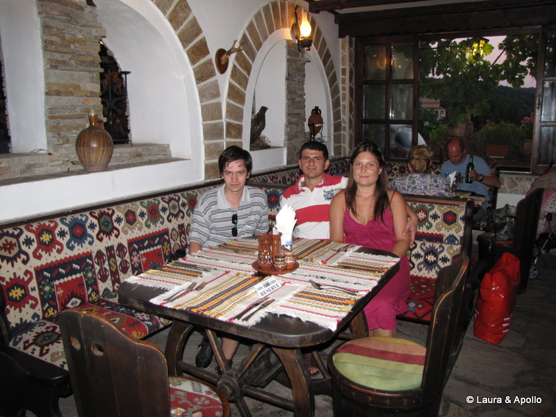 Dupa apusul soarelui am luat masa la restaurantul de care am povestit mai devreme. Mancarea a fost foarte buna, si surprinzator de ieftina, comparativ cu preturile cu care suntem obisnuiti in Romania. De undeva a aparut si o pisicuta care ne-a asigurat portia de distractie. Ne-am indreptat apoi spre cetatea Tsarevets, unde in acea seara a avut loc un spectacol de sunet si lumina, numit „Stage of the Ages„. Pe fundalul unei muzici dramatice si al clopotelor bisericii, intunecatul Tsaravets este inundat de culori si lumini. Intreaga colina este invadata de lumina si in fata vizitatorilor este recreata istoria glorioasa si tragica a imperiului bulgar medieval. Cu sunetul nu prea am avut noroc (doar cei care au luat bilete in cetate au avut parte de el), dar in schimb, luminile proiectate pe zidurile cetatii ni s-au parut foarte frumoase. Spectacolul are loc in serile de sambata, dar nu in fiecare saptamana, asa ca daca vreti neaparat sa-l vedeti, ar fi bine sa verificati programul aici.