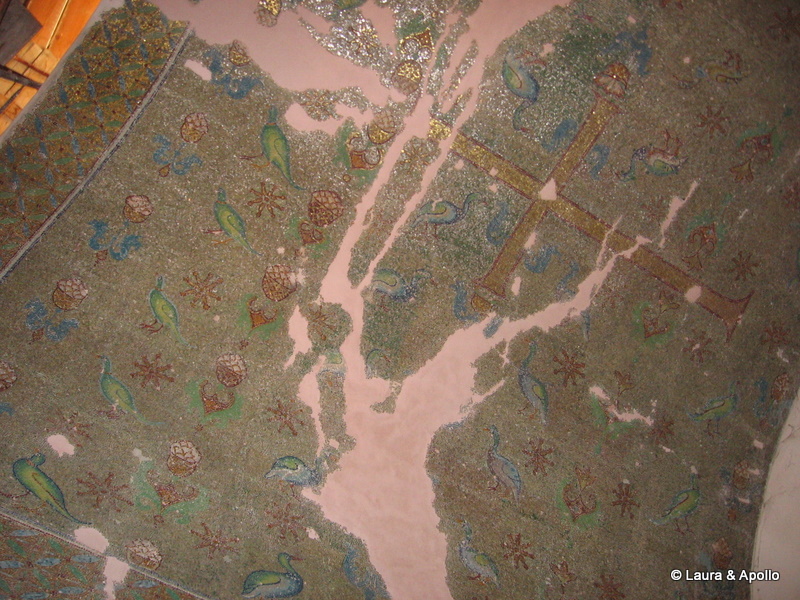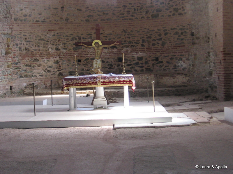 Am trecut iar pe langa palatul lui Galeriu, invadat de teroristi cu blana, sub forma unor pisicute care ar fi facut orice pentru o mangaiere, sau, preferabil, pentru ceva de mancare. Am depasit arcul triumfal (am reusit sa vedem mai bine ce-a ramas din el, pentru ca data trecuta ajunsesem noaptea), si am continuat pana la Rotonda Sfantului Gheorghe, cea mai veche biserica din Salonic (unii spun chiar din lume, dar la titlul asta mai aspira si alti candidati), parte a patrimoniului Unesco. Cladirea cilindrica a fost construita in anul 306, dar nu se stie daca scopul ei era sa adaposteasca mormantul imparatului Galeriu, sau trebuia sa fie templu. Zidurile groase de 6 metri au ajutat-o sa reziste cutremurelor care au distrus alte cladiri in Salonic. Imparatul a fost inmormantat la Felix Romuliana, in Serbia, iar rotonda a ramas goala multa vreme, pana cand imparatul Constantin a cerut sa fie transformata in biserica, si a decorat-o cu mozaicuri deosebite, din care s-au pastrat fragmente pana astazi. Turcii au cucerit Salonicul, au transformat biserica in moschee si au ridicat un minaret, insa dupa razboiul balcanic, a fost din nou sfintita ca biserica. Cand am vizitat-o noi interiorul era acoperit cu schele, asa ca pozele nu-s de calitate prea buna.