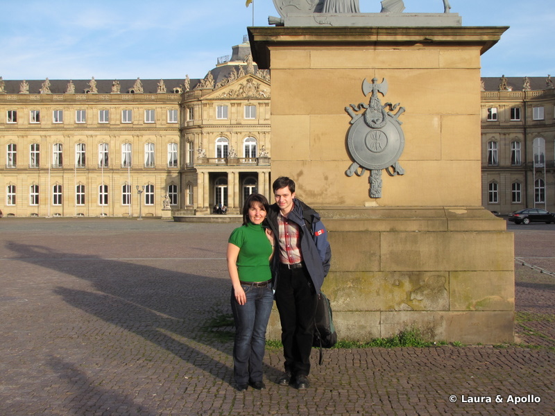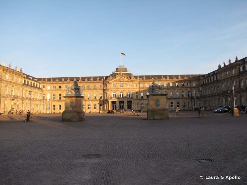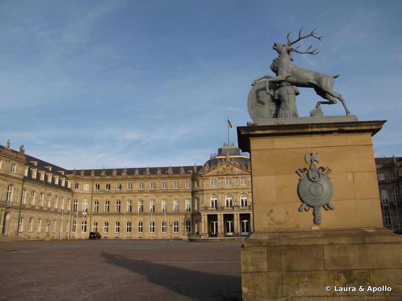 Dupa ce-am privit cu oarecare mirare o mica expozitie de flori amenajata in stil „carucior de supermarket” am traversat piata spre Castelul nou (Neues Schloss). Intrarea in curtea interioara e strajuita de doua statui reprezentand un leu si un cerb, care poarta stema regatului. Palatul a fost inceput in 1746 in stil baroc tarziu, si extins mai tarziu in stil neoclasic. Cladirea a fost aproape complet distrusa in al doilea razboi mondial. Exteriorul a fost refacut in stilul original, nu insa si interiorul, care a fost modernizat. Astazi adaposteste cateva ministere ale landului Baden-Wurttemberg.