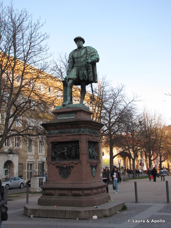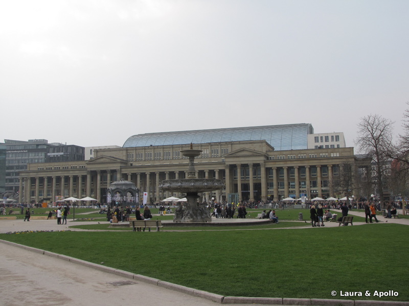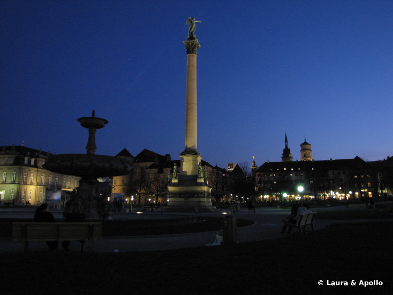 Mergand mai departe pe Konigstrasse am ajuns in piata castelului (Schlossplatz), una din cele mai cunoscute piete din Germania. In centru se afla Coloana Jubileului, ridicata cu ocazia aniversarii a 25 de ani de la urcarea pe tron a regelui Wilhelm I. Piedestalul reprezinta un omagiu adus regelui pentru participarea la razboiul de eliberare din 1814, iar in varf se afla o statuie de bronz care reprezinta „Unitatea”. In apropiere se afla doua fantani decorate cu capete de lei, care reprezinta raurile principale ale regatului. In partea dreapta a pietei se afla Konigsbau (cladirea regelui), o cladire remarcabila de la jumatatea secolului 19 cu o fatada care aminteste de templele grecesti, care ascunde de fapt spatii de birouri si magazine (tehnic vorbind, e un mall in varsta de 150 de ani). Tot aici functioneaza din 2005 muzeul de arta (cica ar fi chiar interesant pentru pasionatii de pictura, noi n-am intrat).