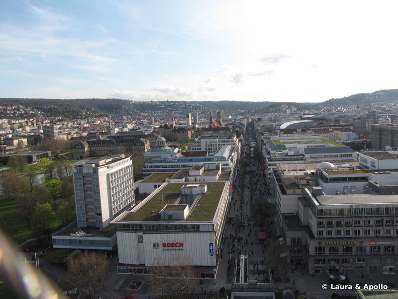 Am coborat din turn si am plecat la o plimbare pe Konigstrasse, principala strada pietonala a orasului, unde se afla o multime de magazine, unele mai cunoscute ca altele, dar toate foarte aglomerate (cred ca era sfarsitul perioadei de reduceri, ca tocmai aparusera reclamele la hainele de vara). Nu m-am putut abtine sa nu-i arat si librariile care ocupau cladiri cu 3-4 etaje, si nu erau deloc pustii, ca prin Bucuresti. Am trecut pe langa catedrala Sfantul Eberhart (un conducator ar ducatului Stuttgart de la inceputul secolului 14), unul din putinele biserici catolice dintr-o regiune predominant protestanta. Am aruncat doar o scurta privire inauntru, pentru ca am nimerit fix in timpul slujbei.