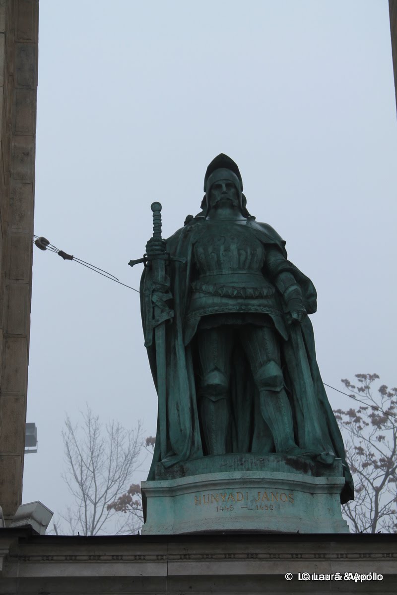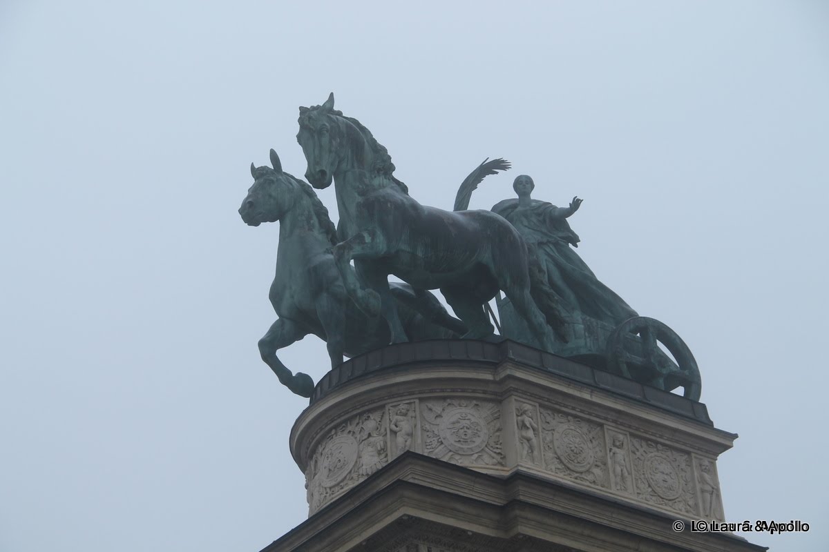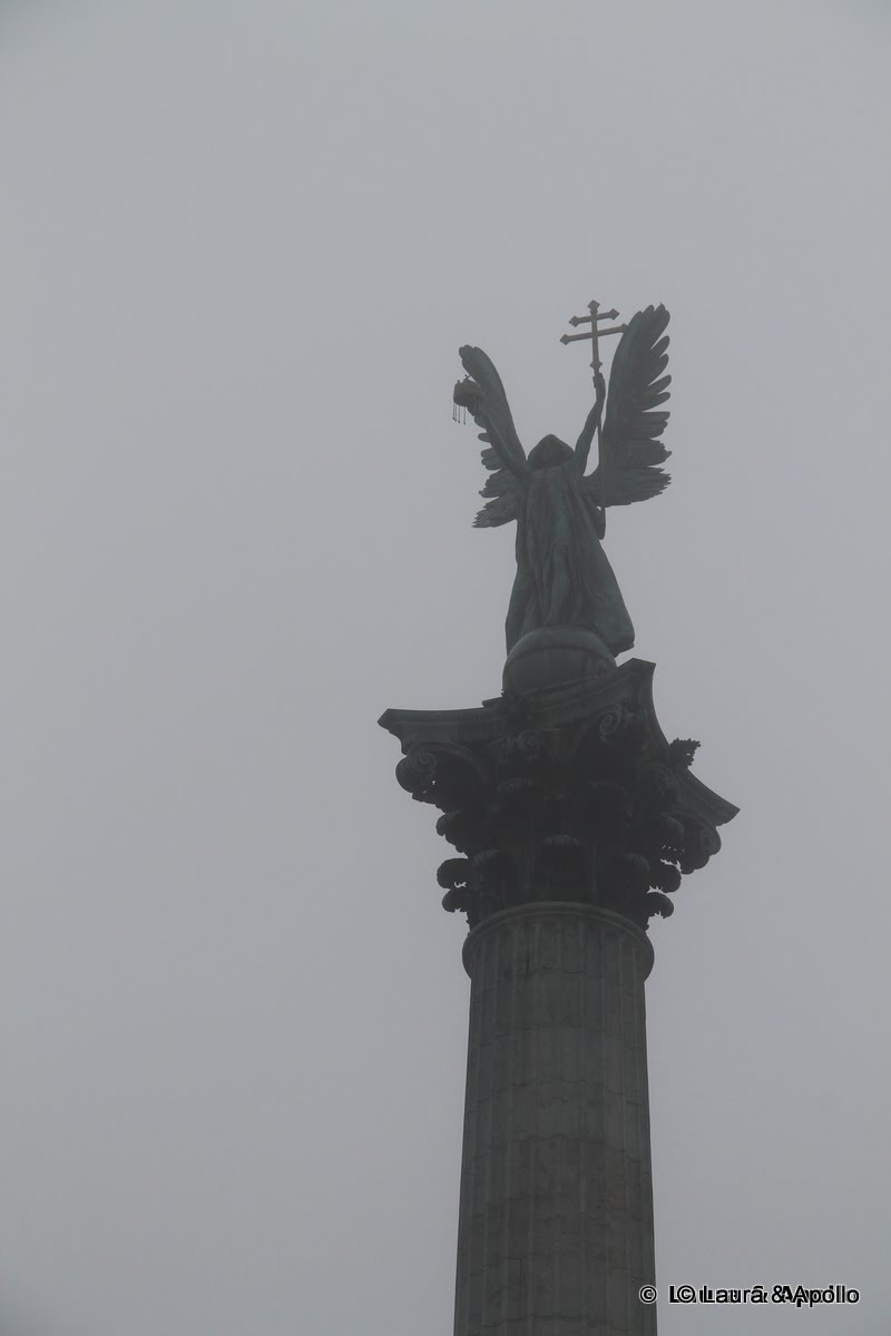 Piata Eroilor (pe limba lor Hosök tere) se afla la capatul bulevardului Andrassy, la mica distanta de parcul central. Cand am iesit din statia de metrou am dat cu ochii de monumentul Millenium, cu varful pierdut in ceata. Constructia ansamblului a inceput in 1896 (anul fondarii statului maghiar), dar a fost finalizat 4 ani mai tarziu, iar astazi face parte din patrimoniul Unesco. De o parte si de alta a pietei se afla Muzeul de arte frumoase si Palatul Artelor, amandoua invaluite in ceata. In mijlocul pietei se afla o coloana inalta, care are in varf statuia arhanghelului Gabriel, tinand in mana coroana Sfantului Stefan si crucea apostolica. In jurul coloanei se pot vedea statuile ecvestre ale celor 7 capetenii care au condus triburile maghiare in Campia Panonica. Cel din fata este Arpad, considerat fondatorul statului maghiar. Costumele lor, desi spectaculoase, nu sunt considerate „corecte” din punct de vedere istoric.