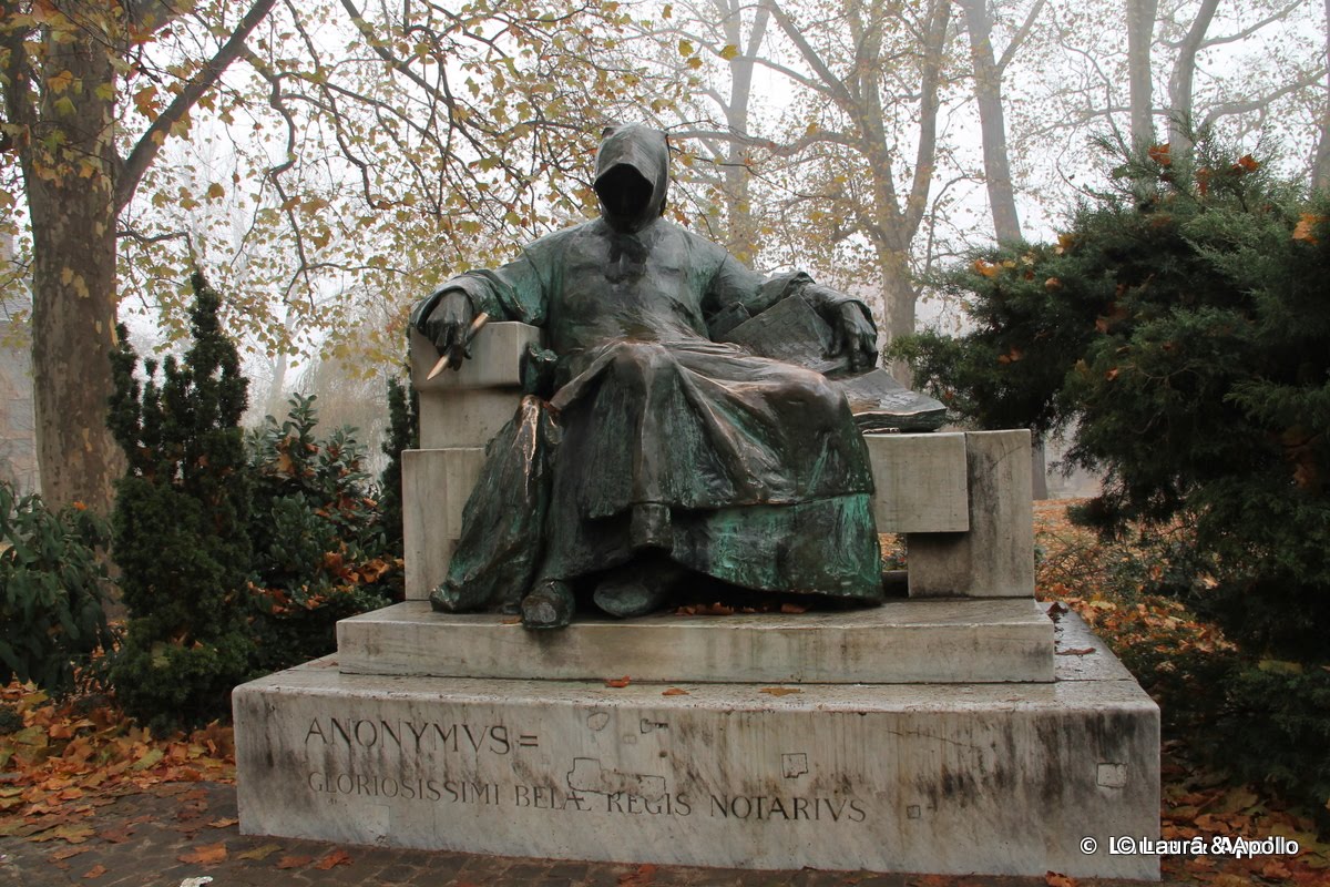 Parasind piata, am traversat strada spre Parcul Central (Városliget), unde am descoperit un frumos peisaj de toamna. Dincolo de patinoarul imens se afla un castel care de la distanta ni s-a parut oarecum cunoscut (am aflat mai tarziu ca e o copie partiala a castelului de la Hunedoara). Nu e insa o copie fidela pentru ca fiecare latura a castelului este reprezentativa pentru un alt stil arhitectonic (romanic, gotic, renascentist si baroc). Castelul Vajdahunyad a fost construit initial din lemn la sfarsitul secolului 19, dar a devenit atat de cunoscut, incat a fost refacut mai tarziu din piatra, iar astazi adaposteste muzeul agriculturii. In curtea castelului am descoperit o alta figura cunoscuta, statuia lui Anonymus, cronicarul anonim al regelui Bela III, care a scris prima carte despre istoria Ungariei. Se spune ca tocul lui aduce noroc, motiv pentru care e bine lustruit de toti vizitatorii.