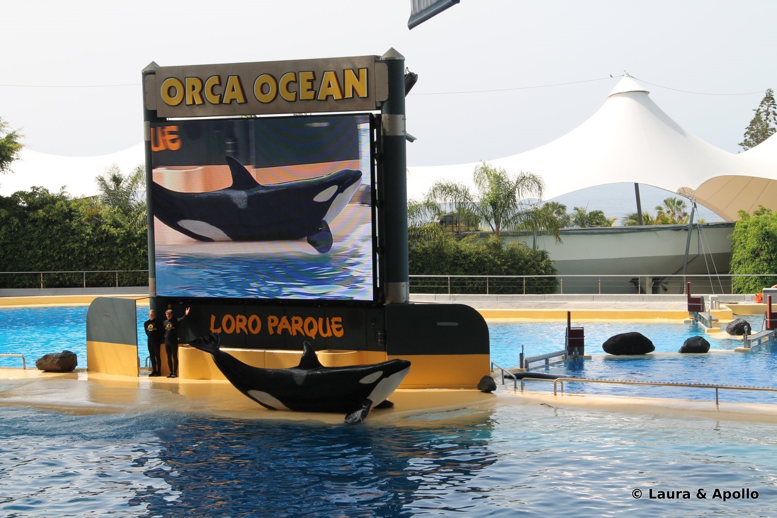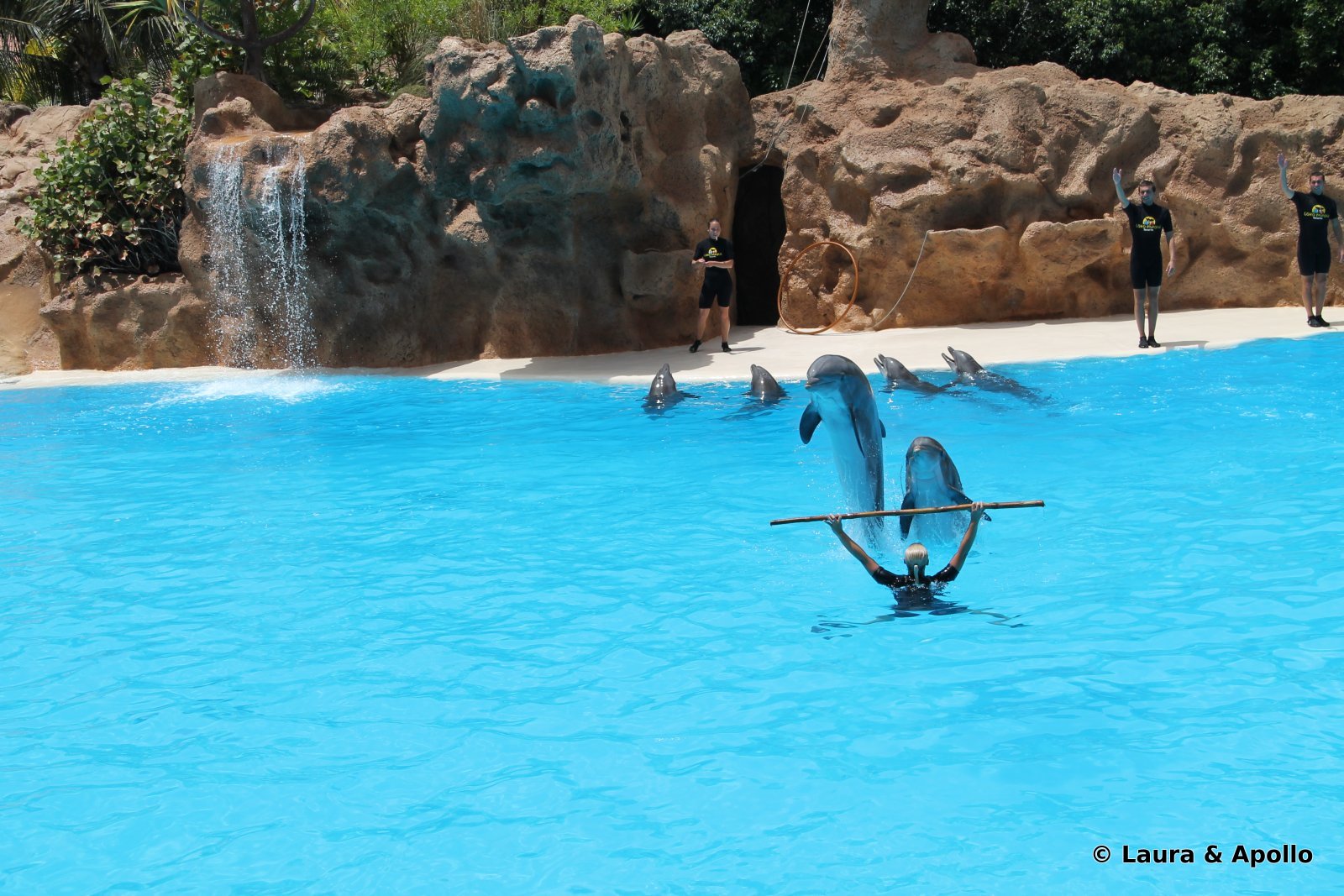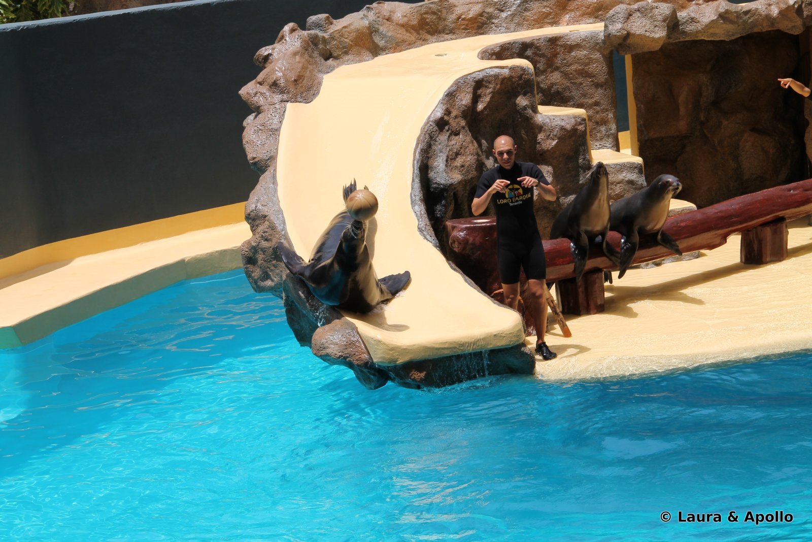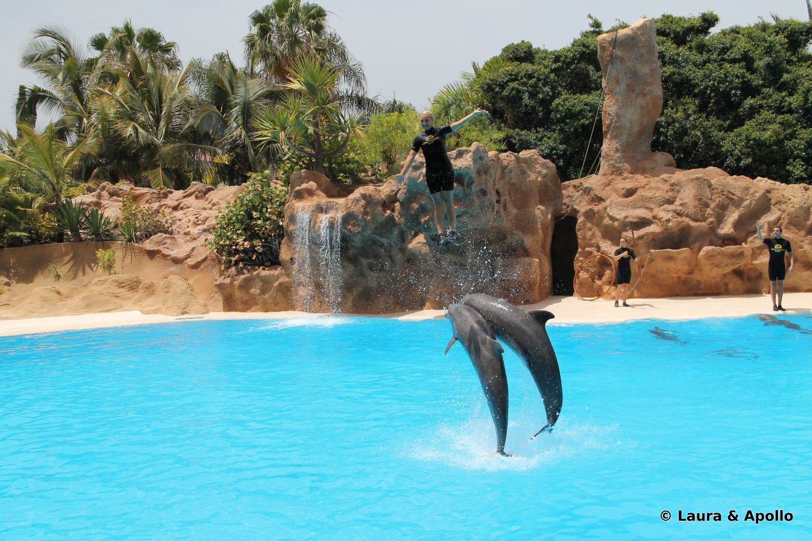 Intrarea in parc se face printr-un ansamblu de cladiri care amintesc de un sat thailandez, lucru usor de inteles daca ne gandim ca in sudul insulei exista un aquaparc cu tema thailandeza, Siam Park, administrat de aceeasi companie. Exista si un bilet combinat pentru ambele parcuri, cu pret (ceva mai) redus. Ca sa nu stati la coada la casa, puteti cumpara biletele de la orice agentie de turism de pe insula. In fiecare zi se organizeaza la ore fixate mai multe spectacole cu animale. Noi ne-am facut programul in asa fel incat sa le vedem pe toate. Am privit ca niste copii jocurile focilor si acrobatiile delfinilor. Sincer sa fiu nu credeam ca la varsta asta ne mai poate impresiona asa ceva, dar am plecat de acolo foarte incantati. Am trecut pe langa o familie de tigri albi, broaste testoase uriase, crocodili, apoi printr-o sera cu orhidee (parca arata putin diferit fata de cele la ghiveci), apoi am intrat la spectacolul cu papagali. Papagalii nu sunt la fel de usor de dresat ca celelalte animale, dar nu ne-a parut rau pentru timpul petrecut acolo, cu zburatoarele colorate plutind deasupra noastra sau facand tot felul de minuni (mergeau pe bicicleta , de exemplu). Era cat pe ce sa intarziem la show-ul cu orci. Nu ne-am imaginat niciodata ca poti convinge niste balene de cateva tone sa faca asemenea sarituri, dar mi s-a parut ca si orcile se distrau stropind spectatorii.
