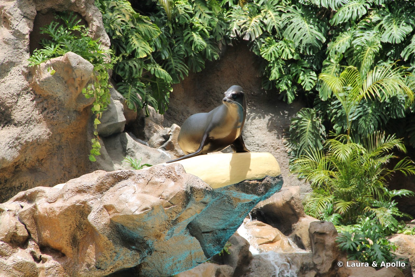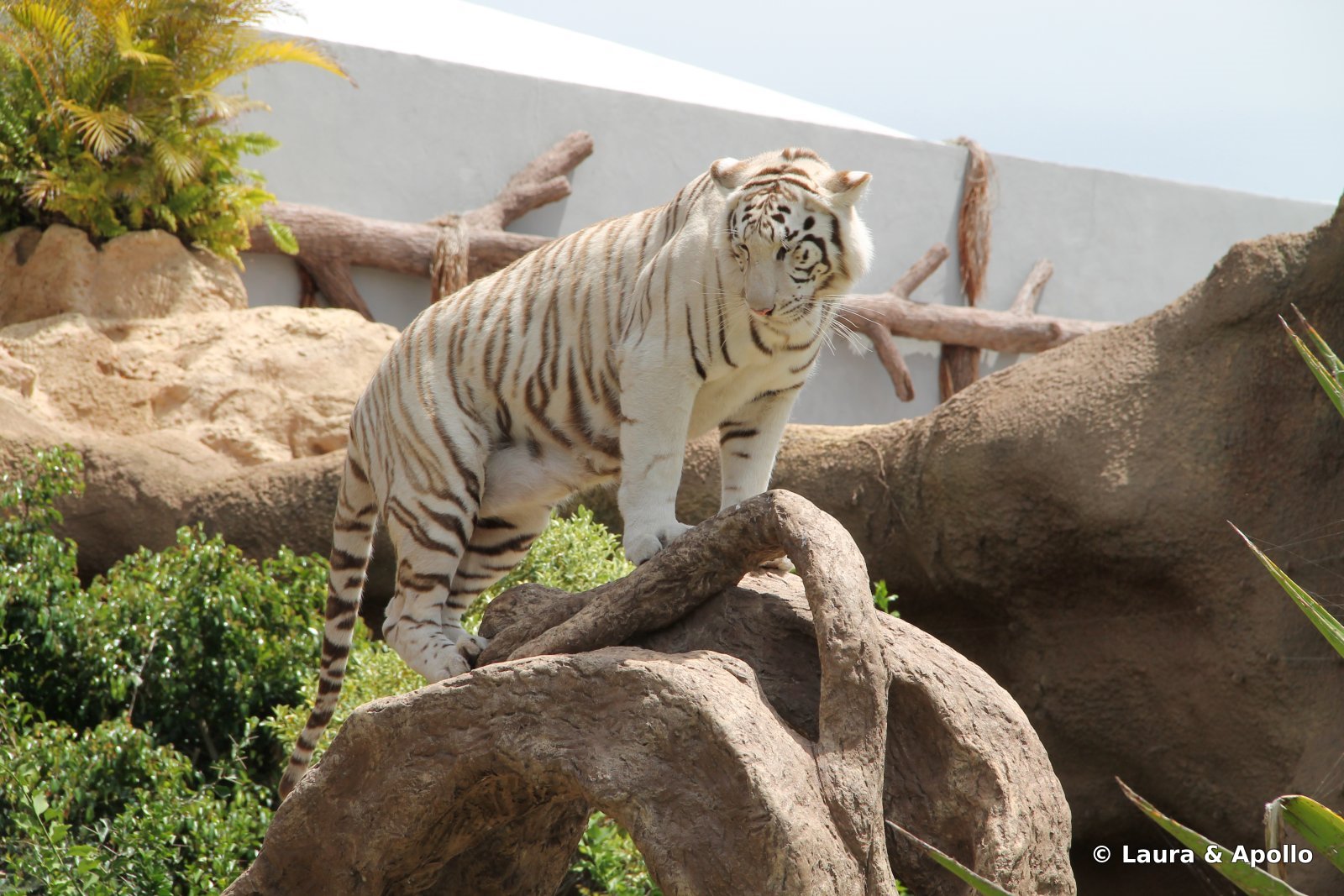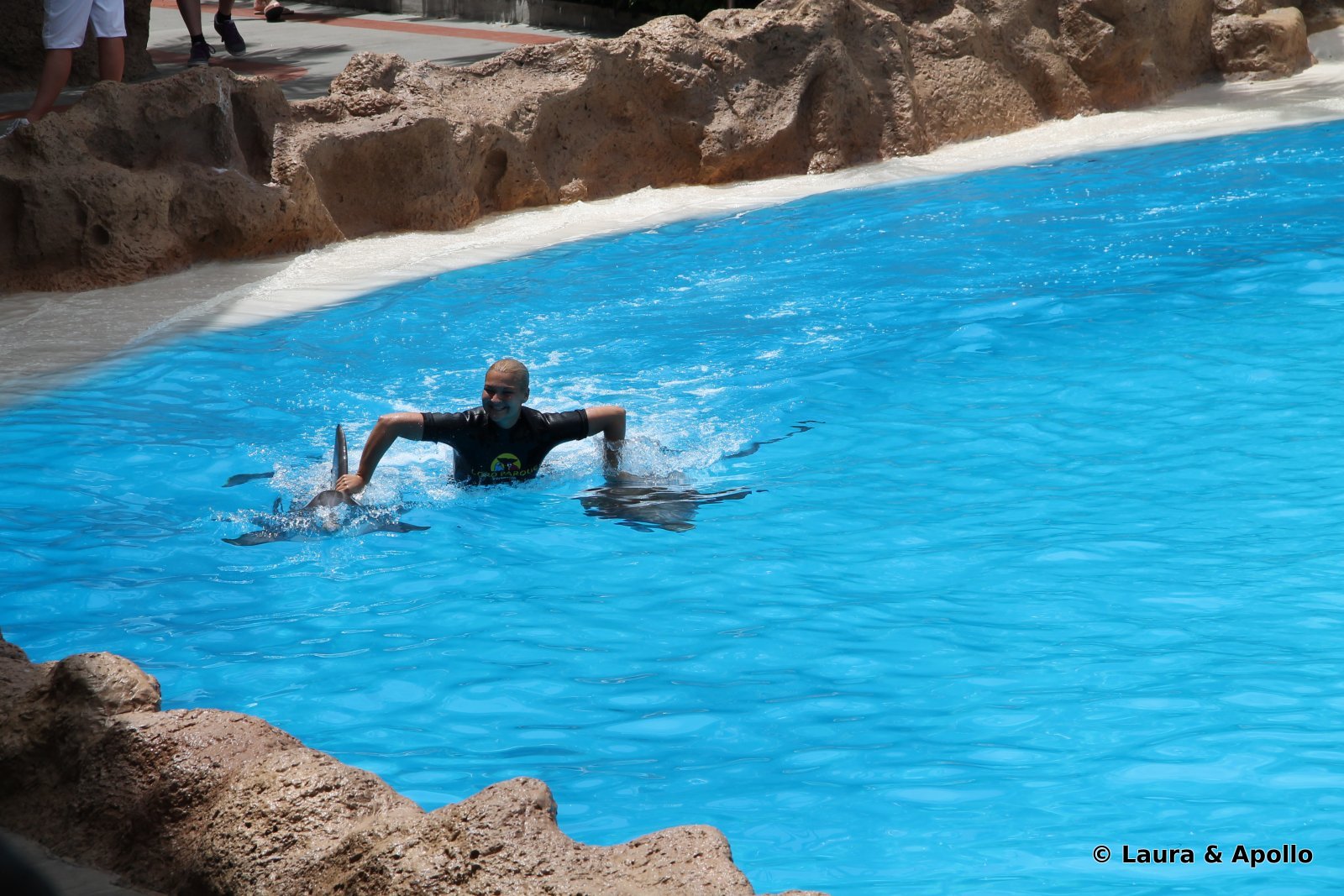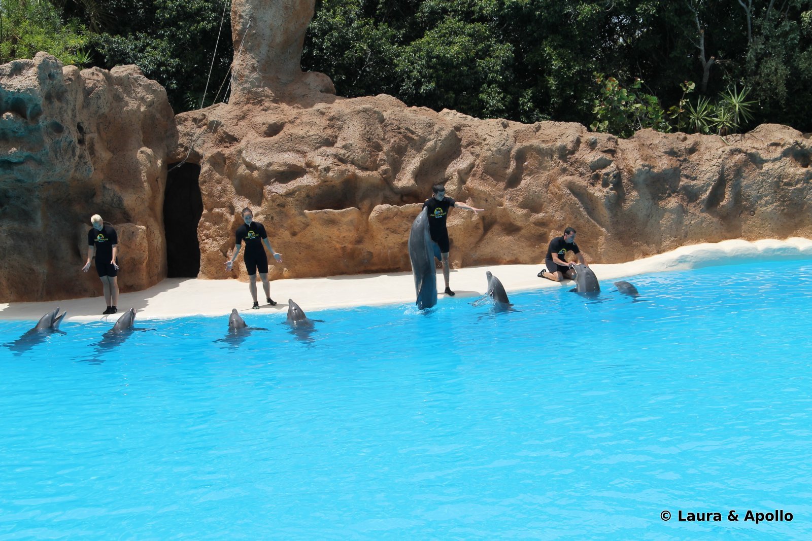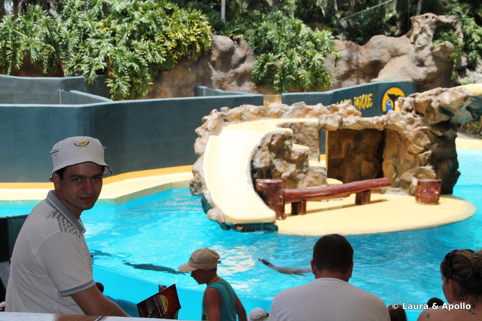 Intrarea in parc se face printr-un ansamblu de cladiri care amintesc de un sat thailandez, lucru usor de inteles daca ne gandim ca in sudul insulei exista un aquaparc cu tema thailandeza, Siam Park, administrat de aceeasi companie. Exista si un bilet combinat pentru ambele parcuri, cu pret (ceva mai) redus. Ca sa nu stati la coada la casa, puteti cumpara biletele de la orice agentie de turism de pe insula. In fiecare zi se organizeaza la ore fixate mai multe spectacole cu animale. Noi ne-am facut programul in asa fel incat sa le vedem pe toate. Am privit ca niste copii jocurile focilor si acrobatiile delfinilor. Sincer sa fiu nu credeam ca la varsta asta ne mai poate impresiona asa ceva, dar am plecat de acolo foarte incantati. Am trecut pe langa o familie de tigri albi, broaste testoase uriase, crocodili, apoi printr-o sera cu orhidee (parca arata putin diferit fata de cele la ghiveci), apoi am intrat la spectacolul cu papagali. Papagalii nu sunt la fel de usor de dresat ca celelalte animale, dar nu ne-a parut rau pentru timpul petrecut acolo, cu zburatoarele colorate plutind deasupra noastra sau facand tot felul de minuni (mergeau pe bicicleta , de exemplu). Era cat pe ce sa intarziem la show-ul cu orci. Nu ne-am imaginat niciodata ca poti convinge niste balene de cateva tone sa faca asemenea sarituri, dar mi s-a parut ca si orcile se distrau stropind spectatorii.