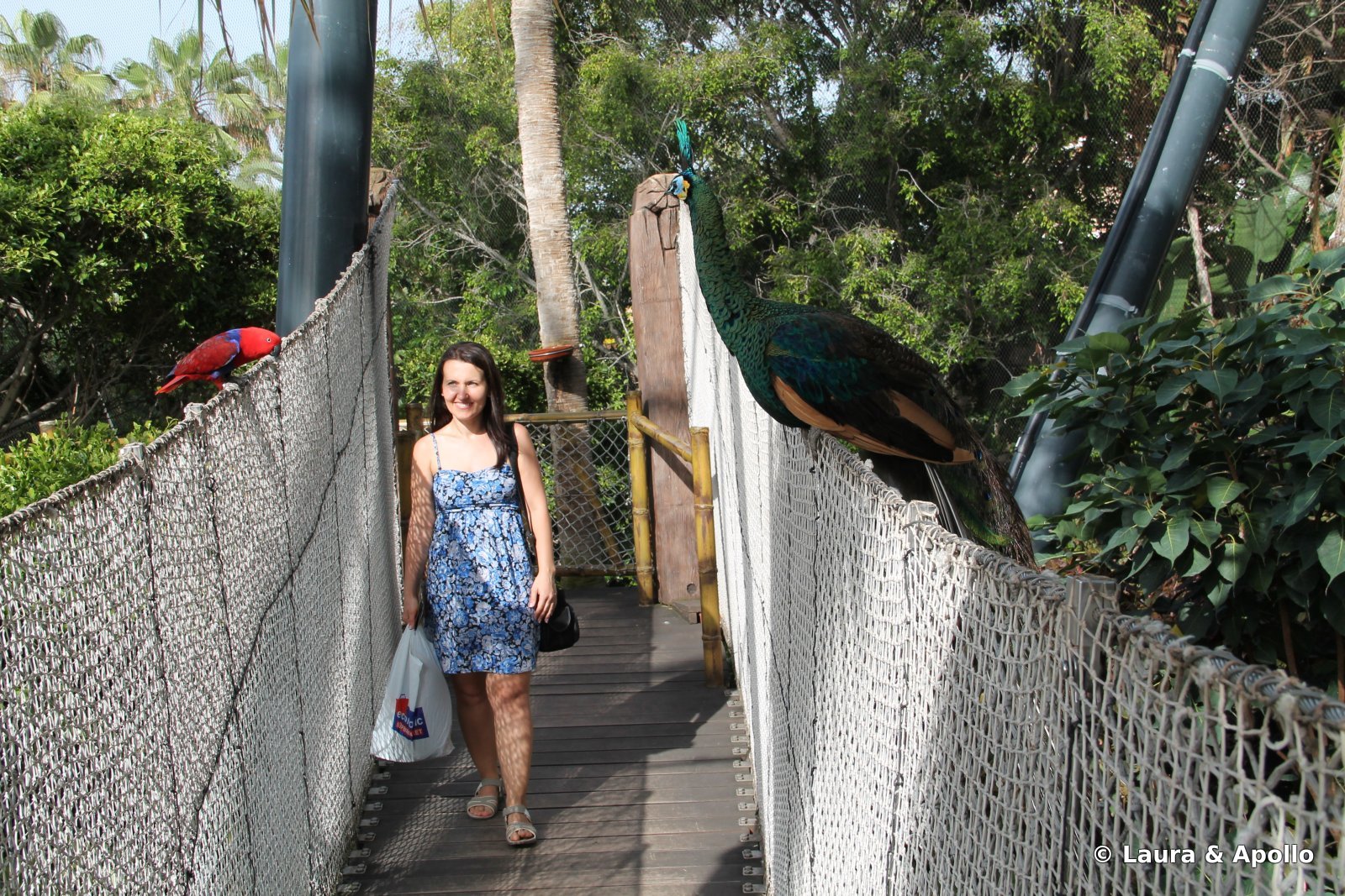 Dupa ce s-a terminat spectacolul, ne-am intors la papagali. Am vazut o multime de specii rare si exotice, dar si foarte frumos colorate. Am traversat o mica jungla, apoi am ajuns… in varful copacilor. Nu ne-am catarat pe crengi, ci am urcat pe scari si am traversat poduri legate de ramurile arborilor. Intr-un spatiu imens, protejat de niste plase asezate la mare inaltime, o multime de pasari colorate zburau libere in jurul vizitatorilor. Desi pareau obisnuite cu oamenii, nu erau totusi foarte prietenoase (adica fugeau daca intindeai mana spre ele). Senzatia a fost absolut fantastica. Ora inchiderii se apropia rapid, dar am reusit sa intram printre ultimii si la acvariu. Pe langa micile expozitii de pesti exotici, foarte colorati, caluti de mare si alte vietuitoare ale oceanului, cel mai spectaculos punct este tunelul subacvatic. Tunelul-acvariu, un coridor transparent de aproape 20 de metri lungime, este cel mai lung din lume. Pe masura ce inaintam prin el, am vazut rechini inotand la doar cativa centimetri distanta.
