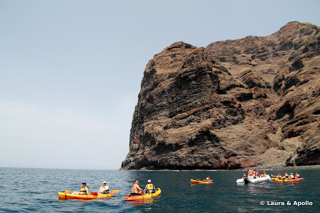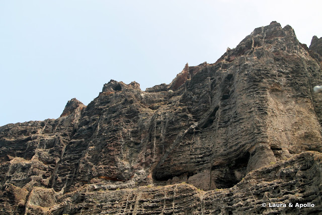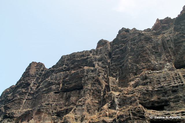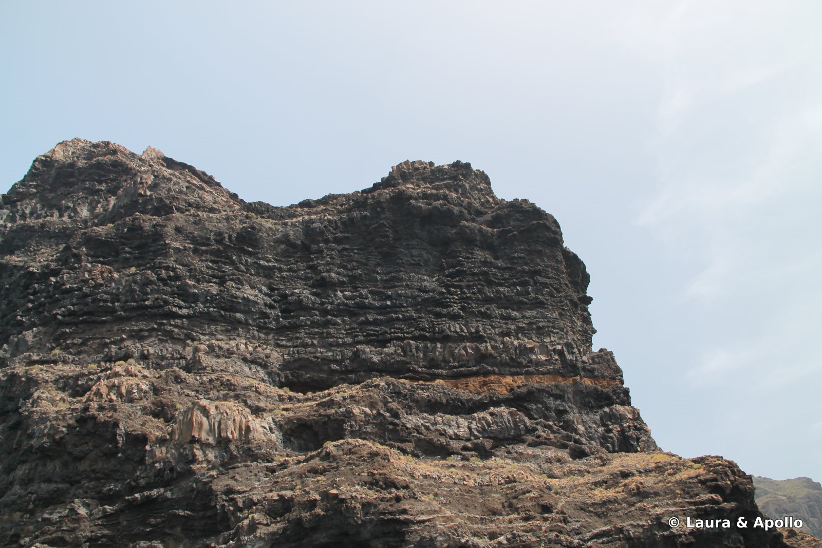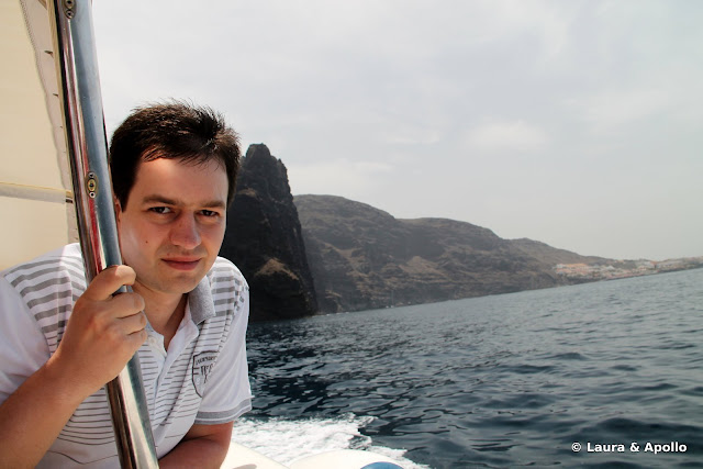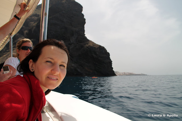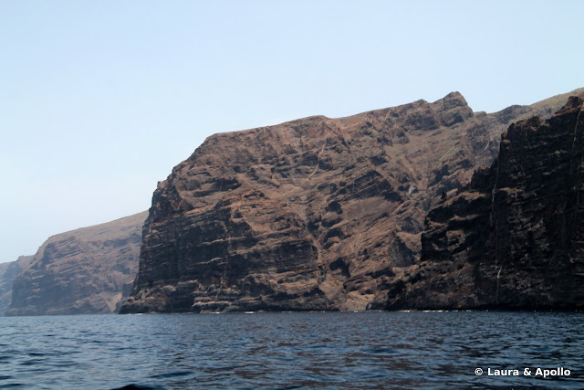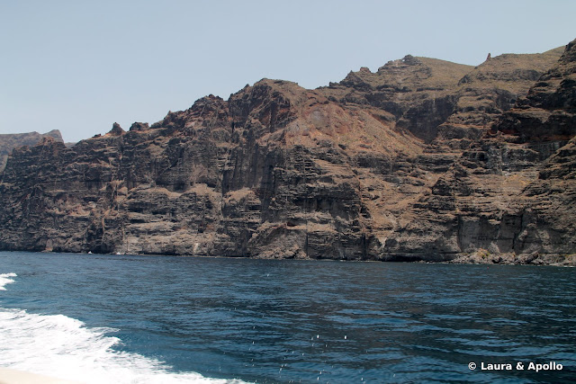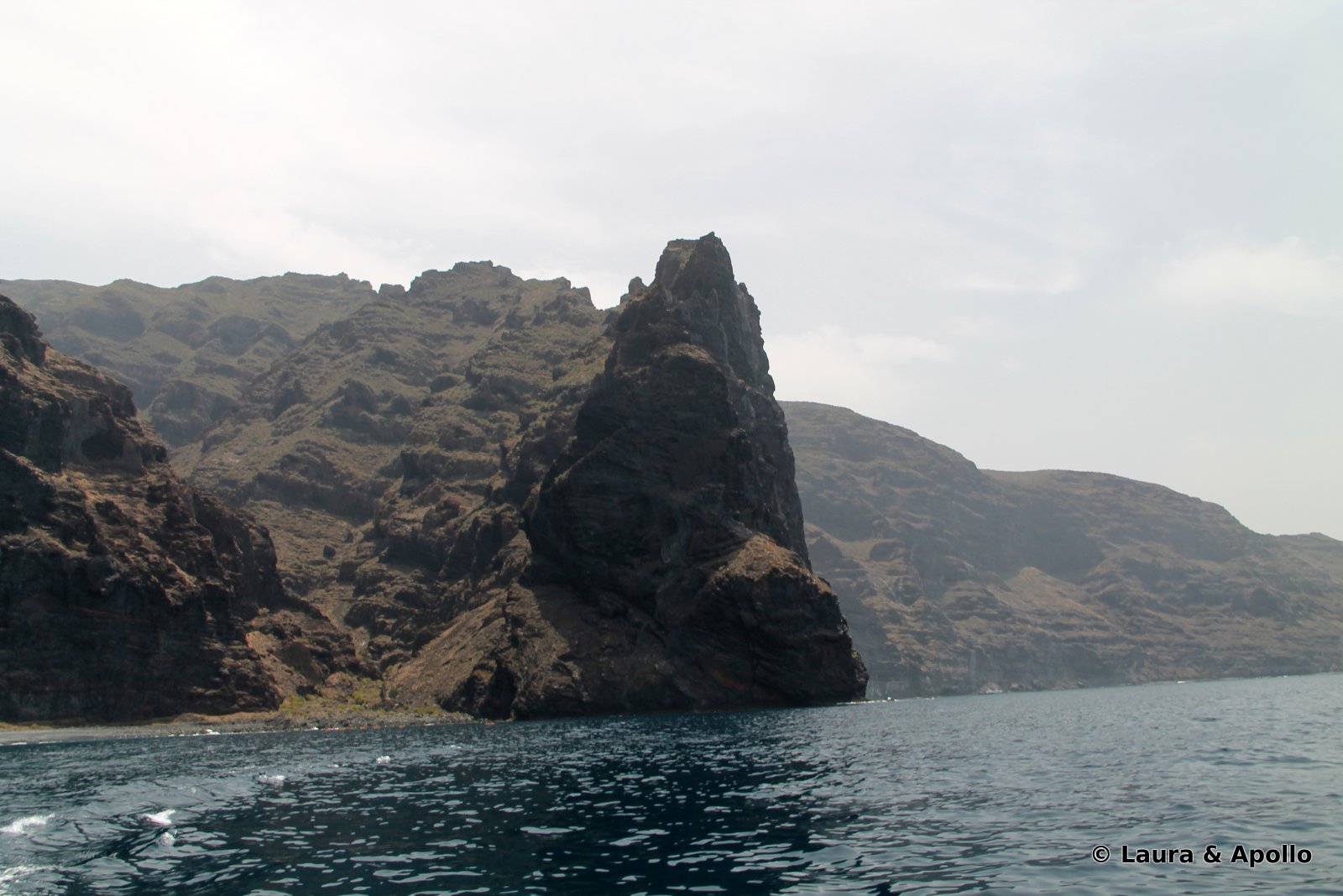 In sfarsit, ne-am urcat pe vaporas si am pornit la drum. Dupa ce ne-am indepartat binisor de port, am gasit un grup de delfini, si putin mai departe unul de balene pilot. N-am vazut niciodata asemenea animale in libertate, asa ca intalnirea a fost cu atat mai placuta. Capitanul ne-a anuntat ca nu vom sta prea mult acolo, pentru ca „toate fetele se vor colora in verde”. Ne-am indreptat apoi spre stancile uriase, iar delfinii, foarte prietenosi, ne-au insotit o parte din drum. Los Gigantes isi merita cu prisosinta numele: trebuie sa vezi un alt vaporas trecand pe langa ei ca sa iti dai seama cat de mari sunt de fapt. Stancile fac parte din cea mai veche portiune a insulei, lantul de munti vulcanici Teno, care s-au format cu mult inaintea varfului principal pe care-l vedem astazi, Pico del Teide. De-a lungul timpului, oceanul a sapat la baza craterului, care s-a prabusit in mare. Ceea ce a ramas este de fapt un perete al vulcanului, in care se pot vedea canalele prin care lava fierbinte urca spre suprafata.