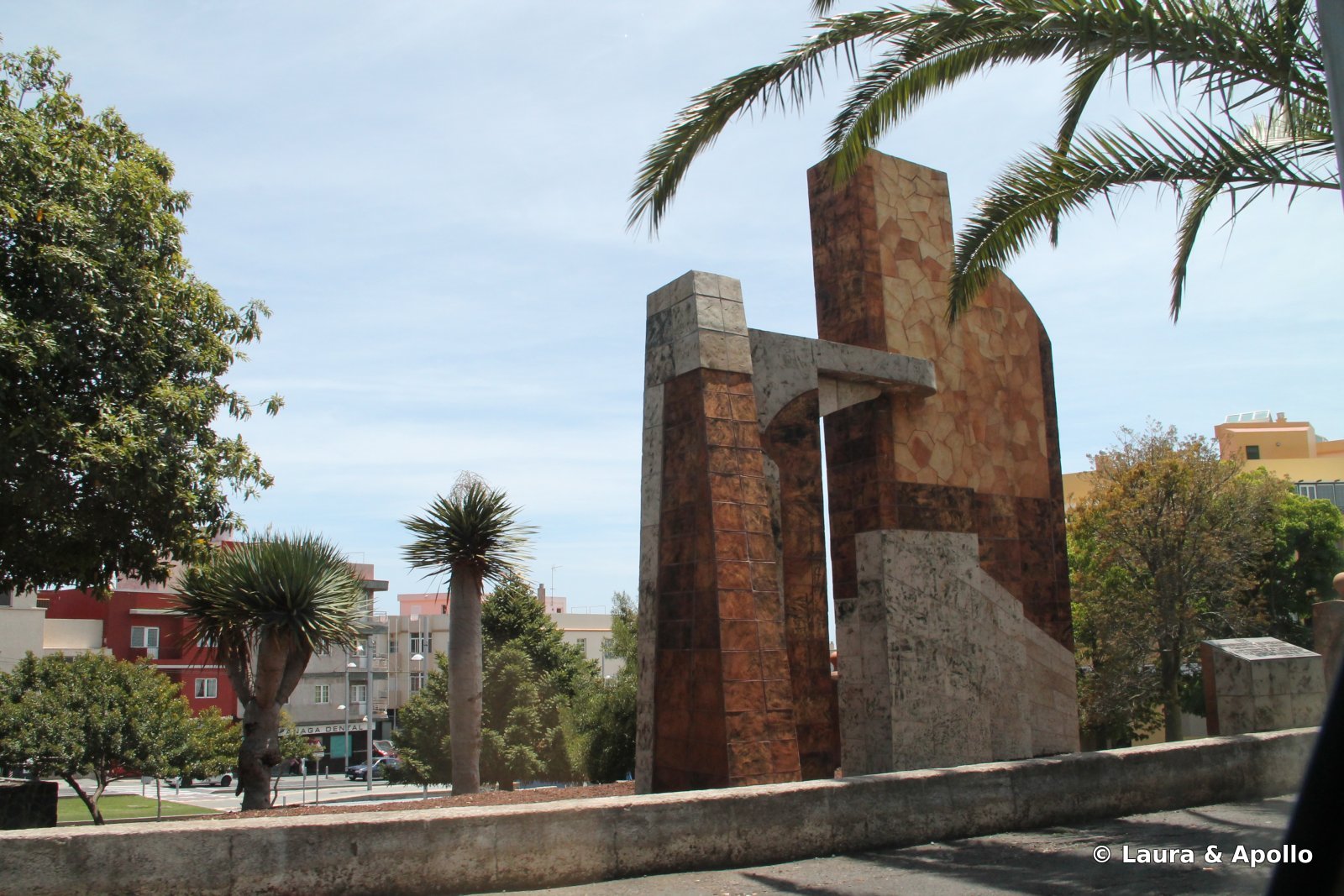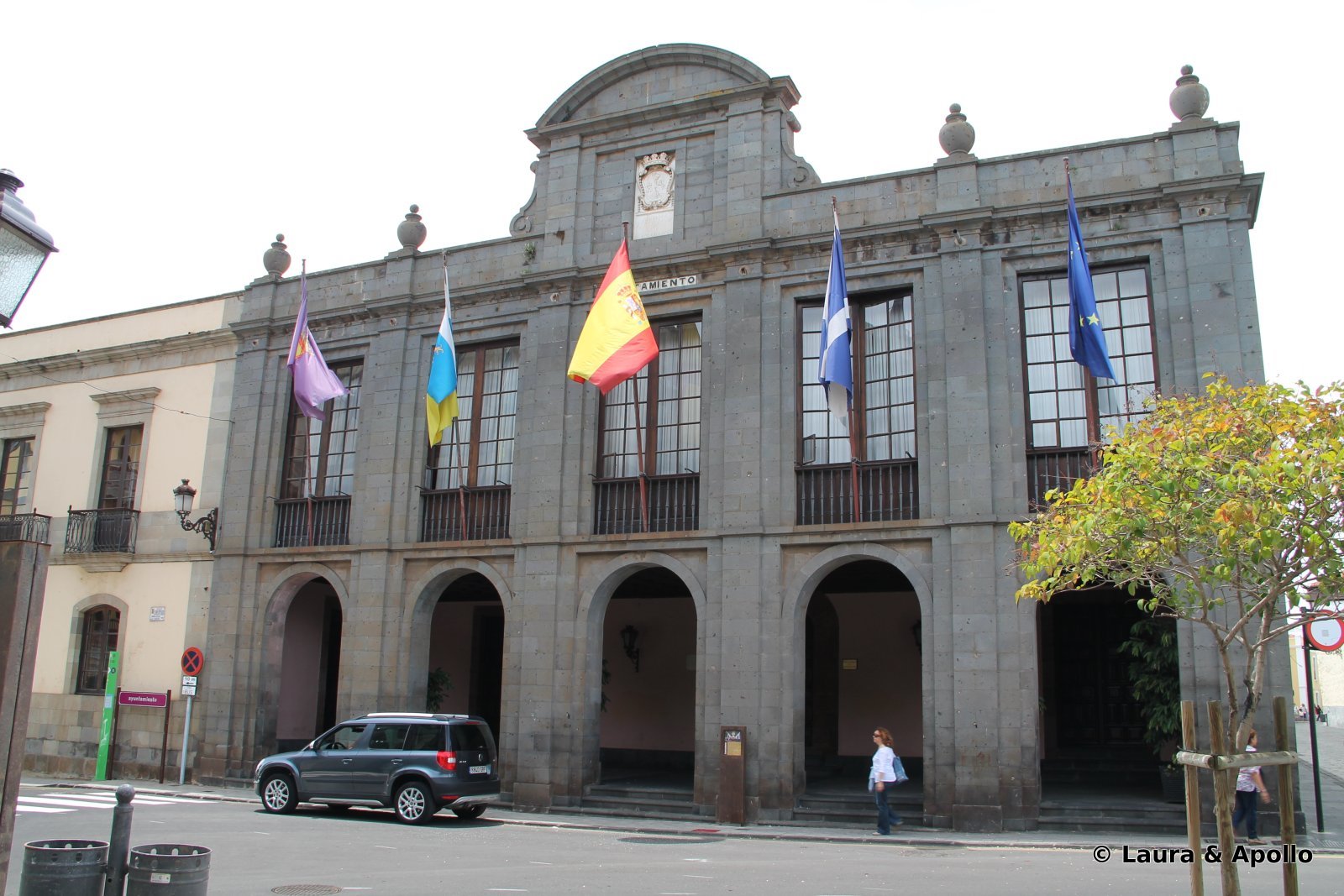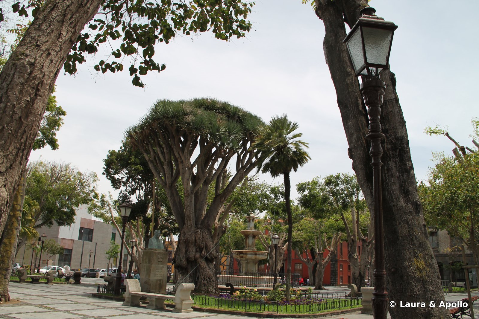Noi am ajuns la La Laguna inainte de pranz, dupa ce am condus cam o ora pe autostrada care insoteste coasta de est a insulei. Aventura gasirii unui loc pentru masina s-a sfarsit dupa vreo 20 de minute, intr-o parcare subterana. Cand am coborat din masina am descoperit pe pielea mea ce inseamna soarele tropical: o ora de condus mi-a lasat pe maini niste arsuri cum n-am avut nici dupa o zi intreaga pe plajele Marii Negre. Am aplicat un stat generos de crema de protectie si am plecat sa exploram orasul. Intamplator, oprisem foarte aproape de centru, asa ca ne-am tras sufletul cateva minute pe o banca intr-un parc de langa primarie. Am vrut sa intram ca sa vedem steagul pe care spaniolii l-au infipt in pamantul insulei dupa ce au cucerit-o, cu 500 de ani in urma, dar era incuiat, desi cu doar cateva minute in urma vazusem o mireasa iesind din cladire (ce ti-e si cu siesta asta…).