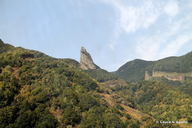 Am mai facut o ultima oprire langa niste stanci foarte spectaculoase, ramasitele unor vechi conuri vulcanice. La fel ca si Tenerife, La Gomera este o insula vulcanica. Aici insa, muntii nu mai arunca lava de multe mii de ani. In timp, peretii craterelor s-au erodat, iar lava intarita din interior, mult mai dura, a ramas sub forma unor bolovani imensi, cu un echilibru incert. Desi stancile pare aproape verticale, varfurile lor erau locurile preferate de bastinasii guanches pentru ceremonii religioase.